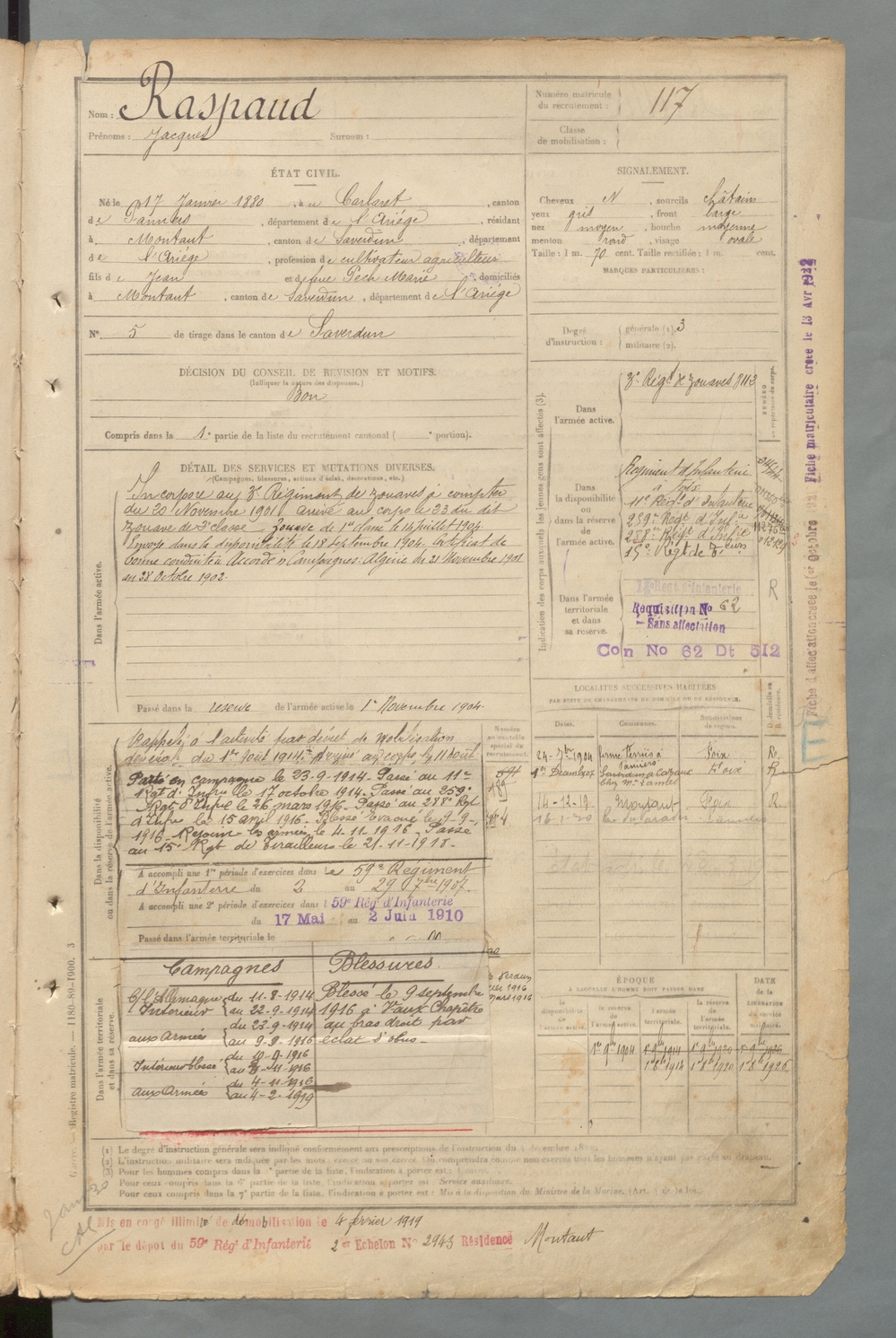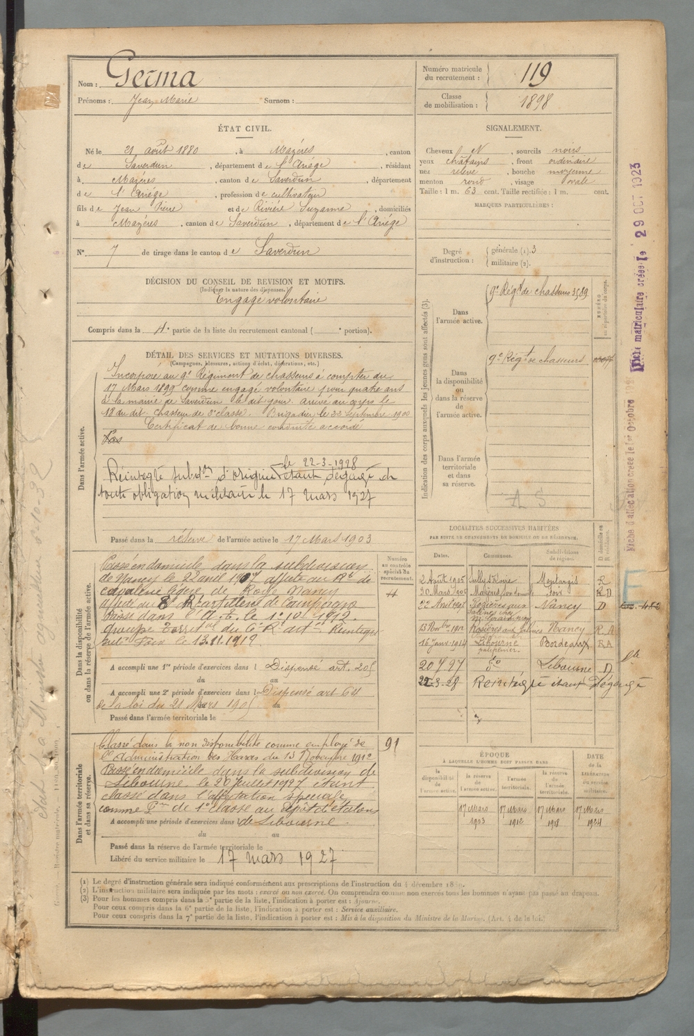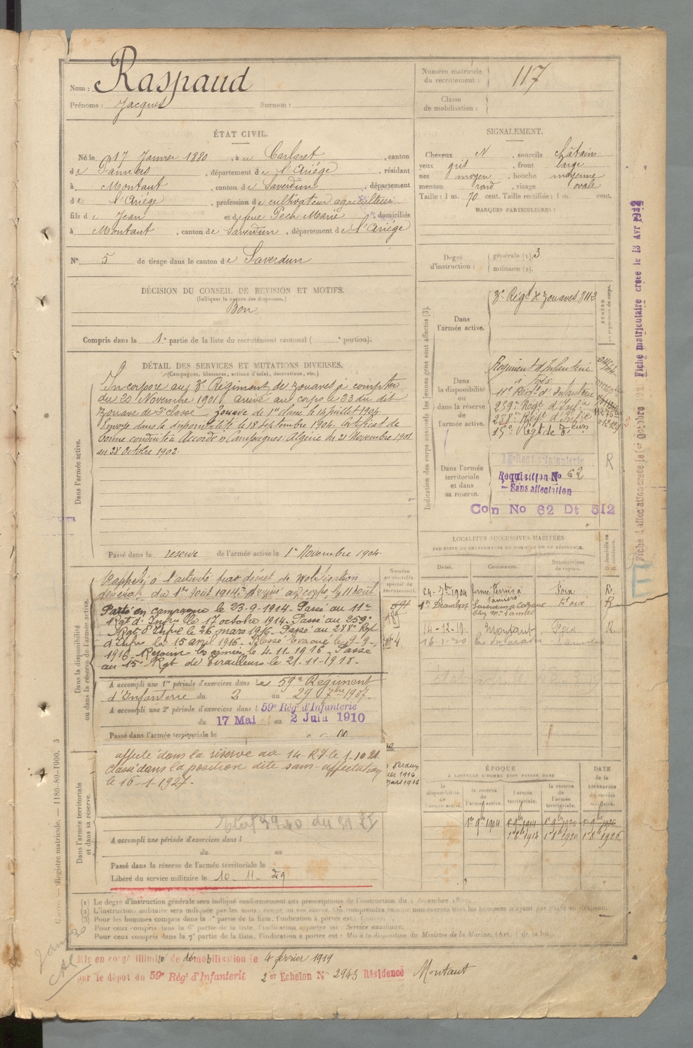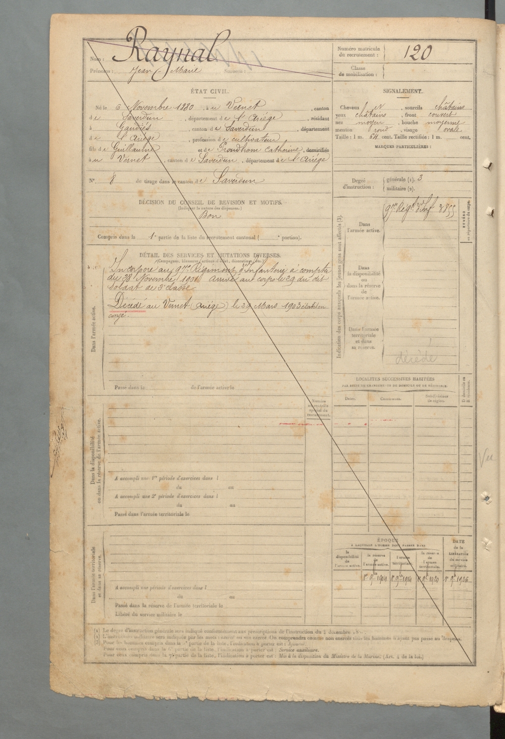 | Raynal | Jean-Marie | FOIX | 129 W 2 | 1900 | Vernet (Le) | Gaudiès | 120 |