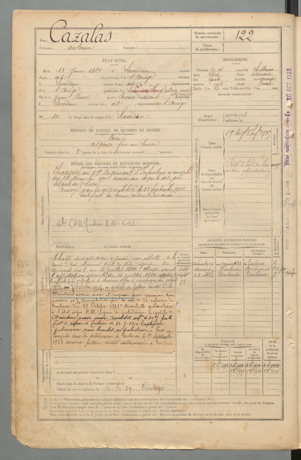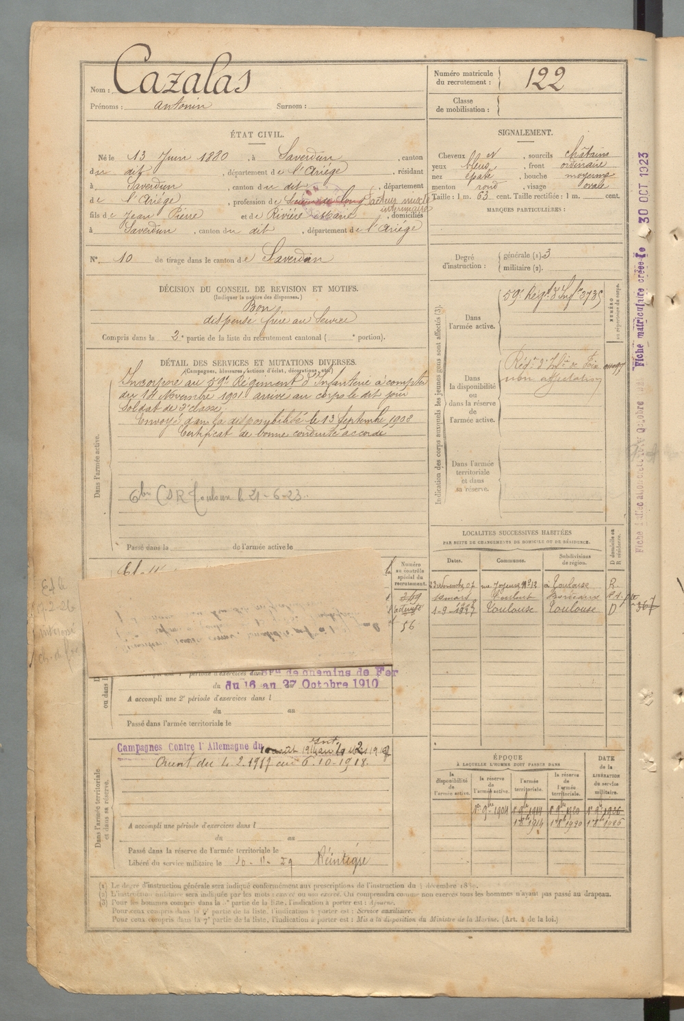 | Cazalas | Antonin | FOIX | 129 W 2 | 1900 | Saverdun | Saverdun | 122 |