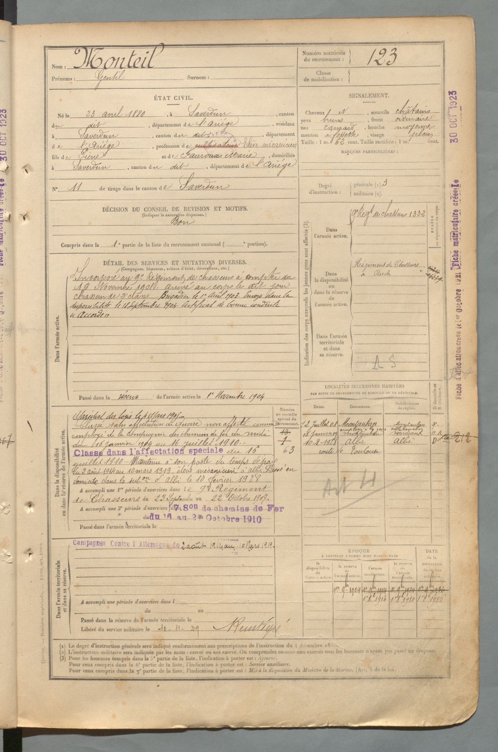 | Monteil | Gentil | FOIX | 129 W 2 | 1900 | Saverdun | Saverdun | 123 |