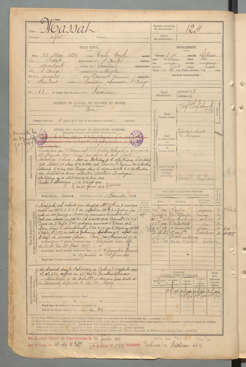 | Massat | Alfred | FOIX | 129 W 2 | 1900 | Carla-Bayle (Le) | Montaut | 124 |