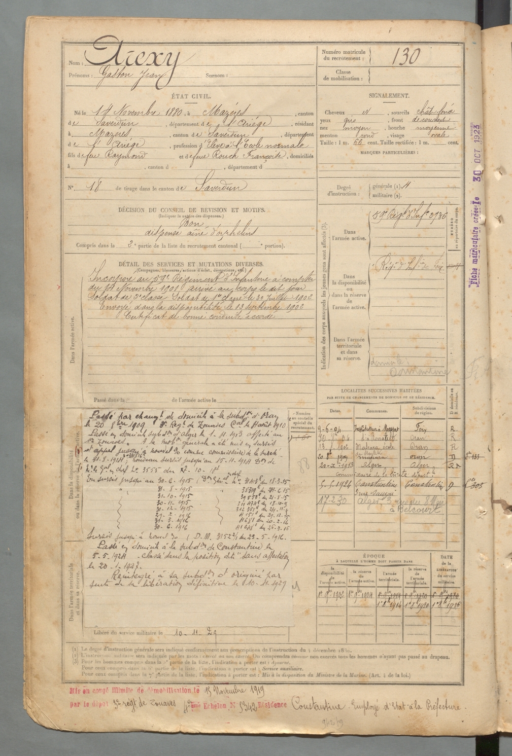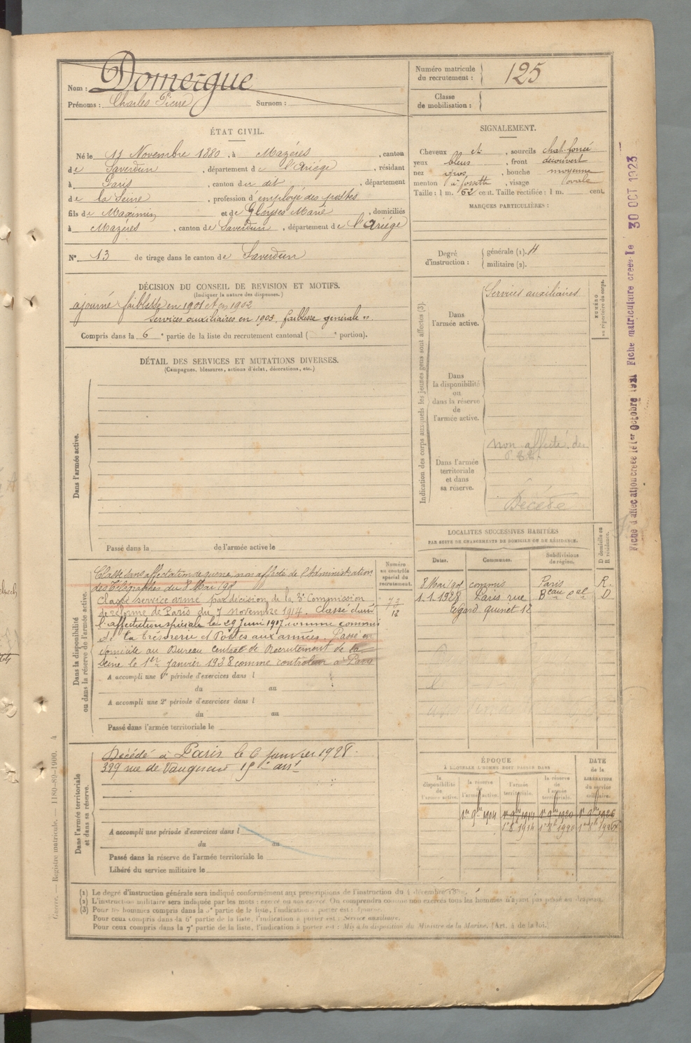 | Domergue | Charles Pierre | FOIX | 129 W 2 | 1900 | Mazères | Paris | 125 |