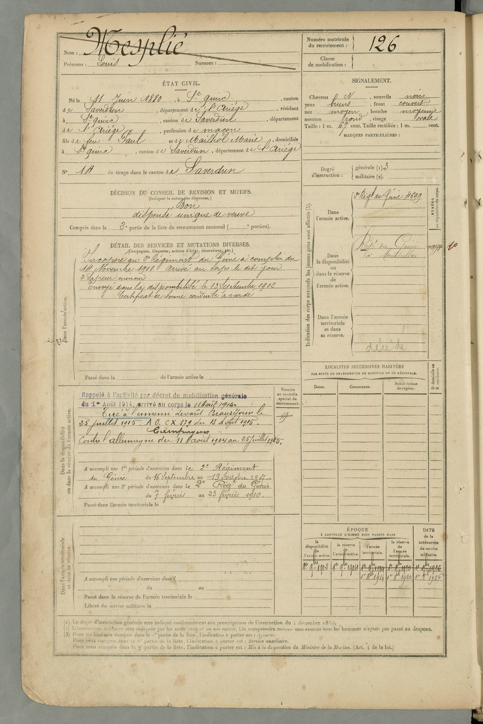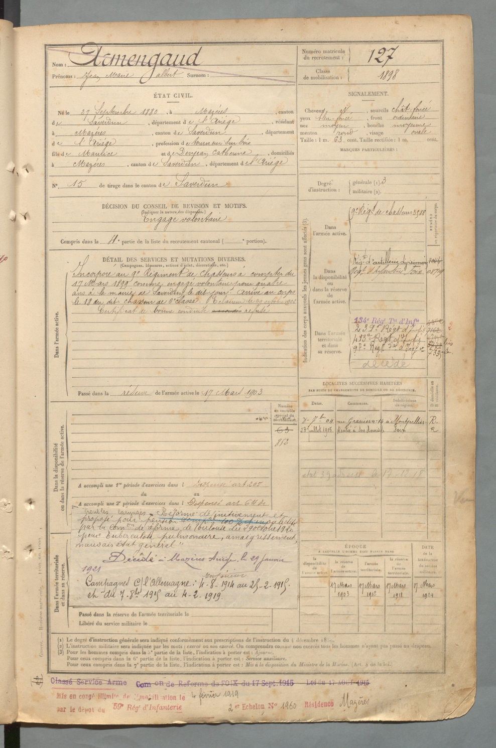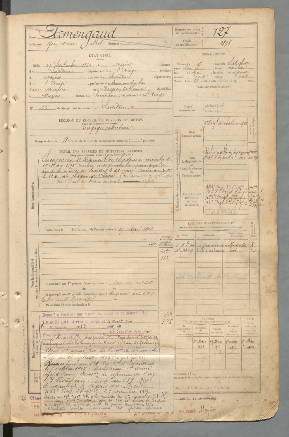 | Armengaud | Jean Marie Albert | FOIX | 129 W 2 | 1900 | Mazères | Mazères | 127 |
