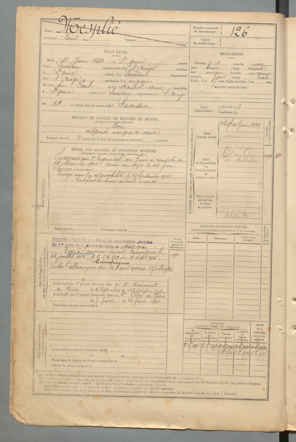| Mesplié | Louis | FOIX | 129 W 2 | 1900 | Saint-Quirc | Saint-Quirc | 126 |