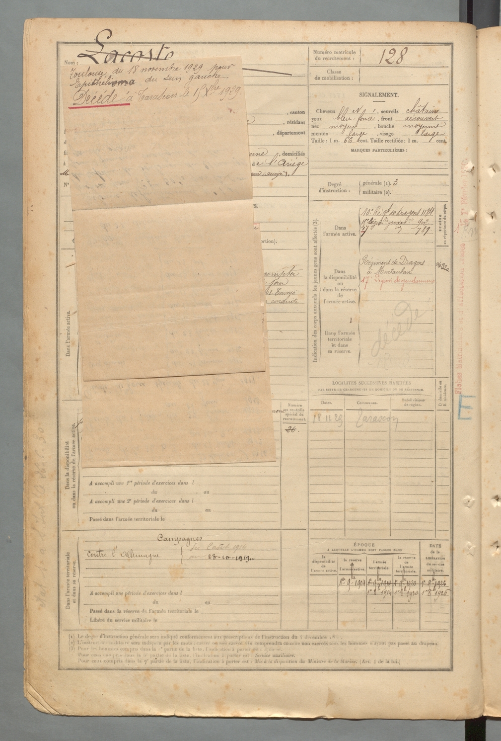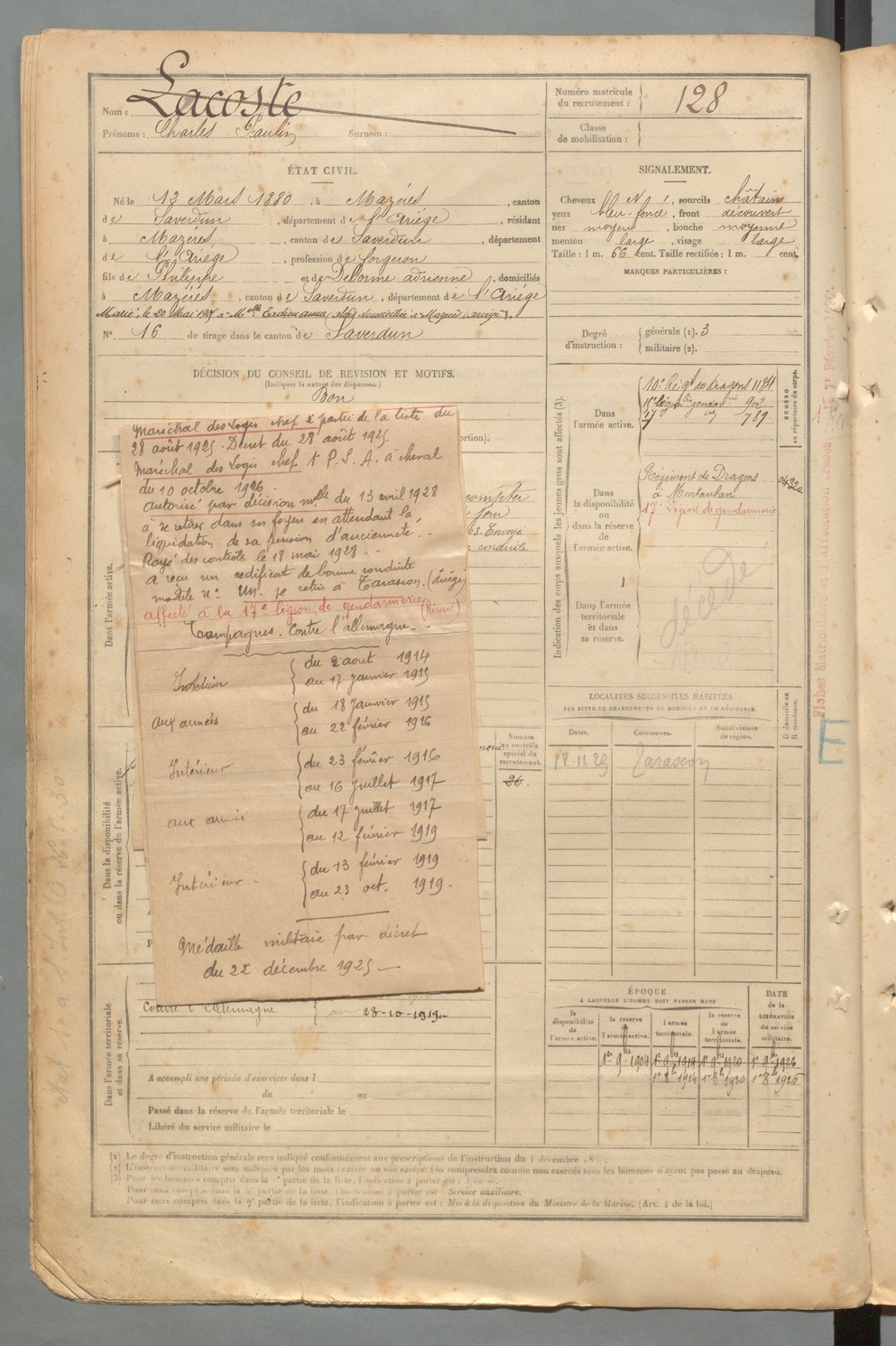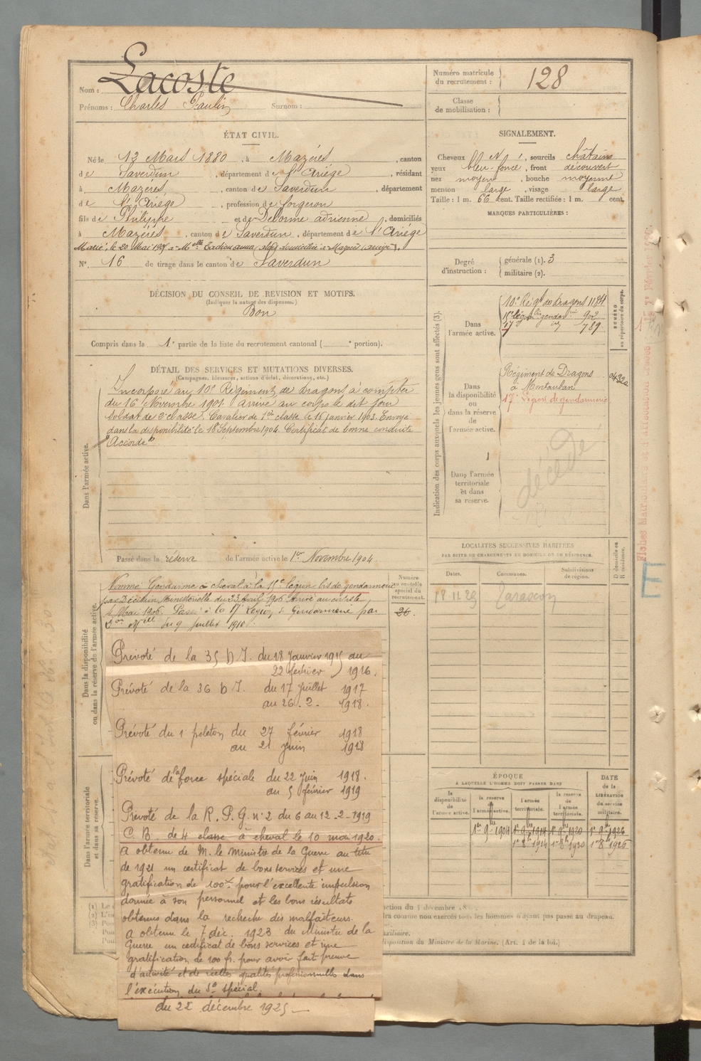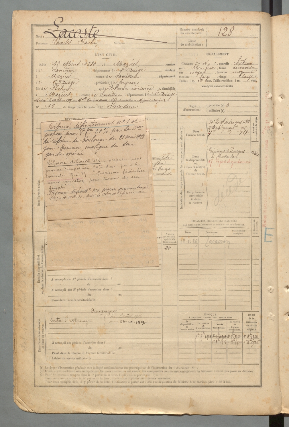| Lacoste | Charles Paulin | FOIX | 129 W 2 | 1900 | Mazères | Mazères | 128 |