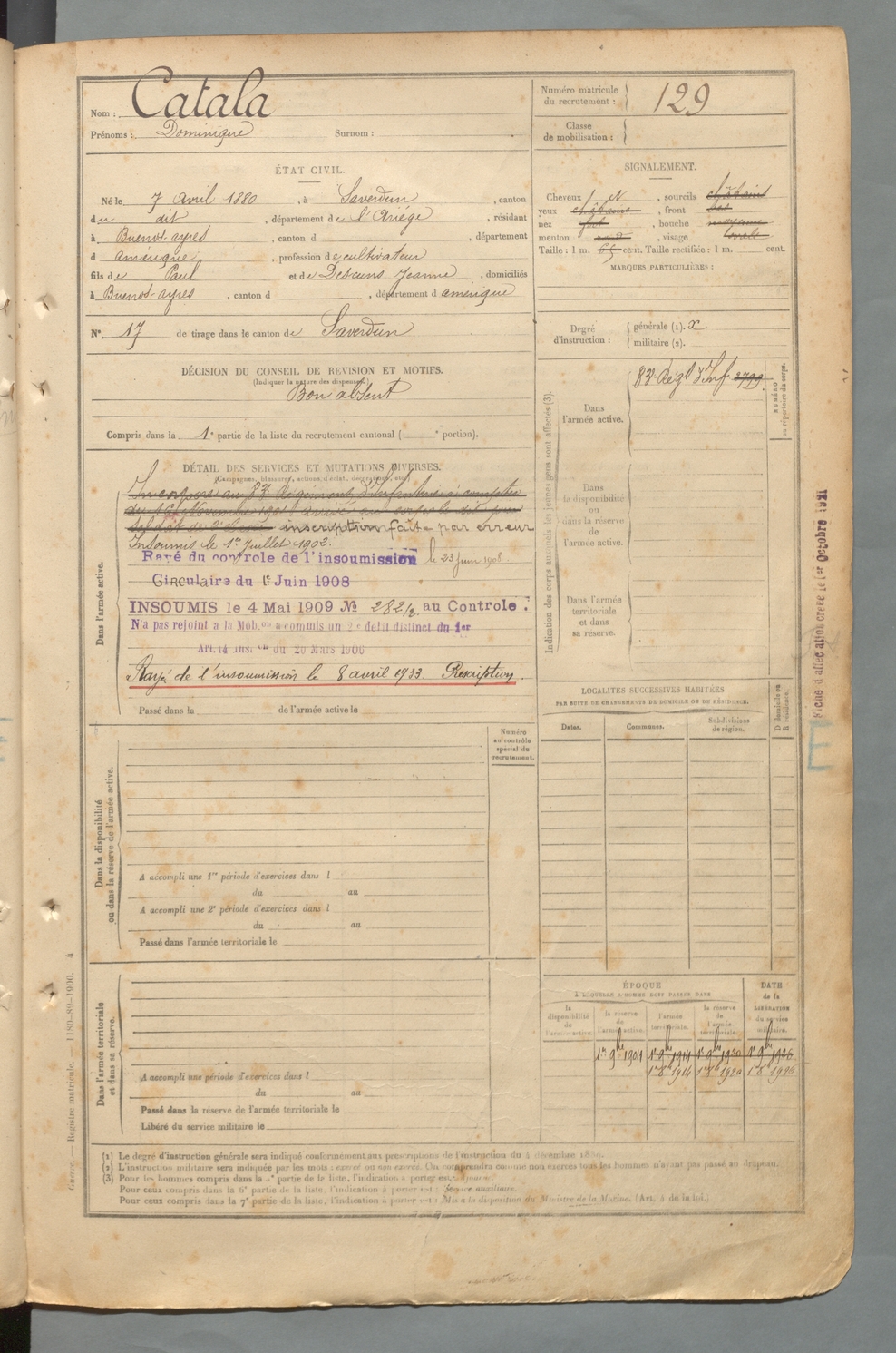 | Catala | Dominique | FOIX | 129 W 2 | 1900 | Saverdun | Buenos-Ayres | 129 |