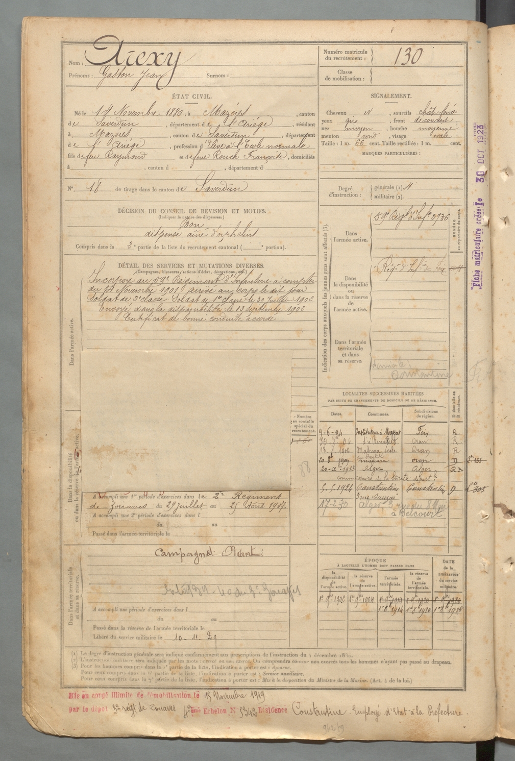 | Arexy | Gaston Jean | FOIX | 129 W 2 | 1900 | Mazères | Mazères | 130 |