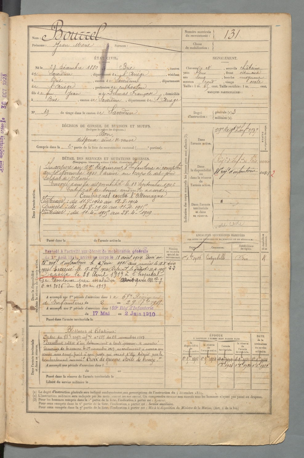 | Bourrel | Jean Marie | FOIX | 129 W 2 | 1900 | Brie | Brie | 131 |