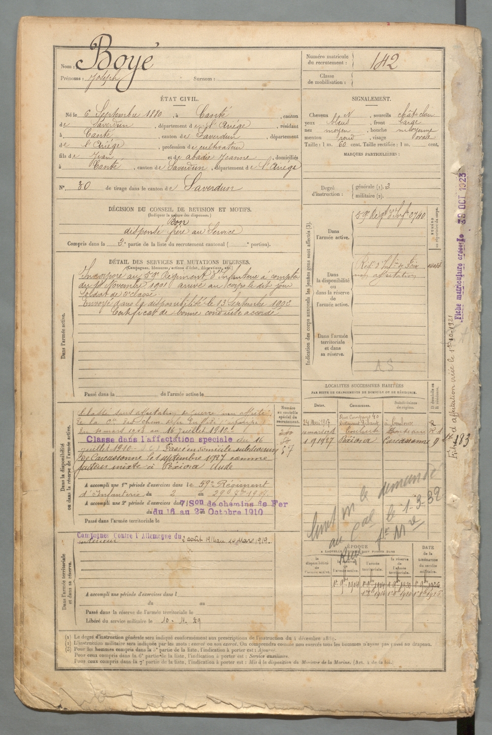 | Boyé | Joseph | FOIX | 129 W 2 | 1900 | Canté | Canté | 142 |