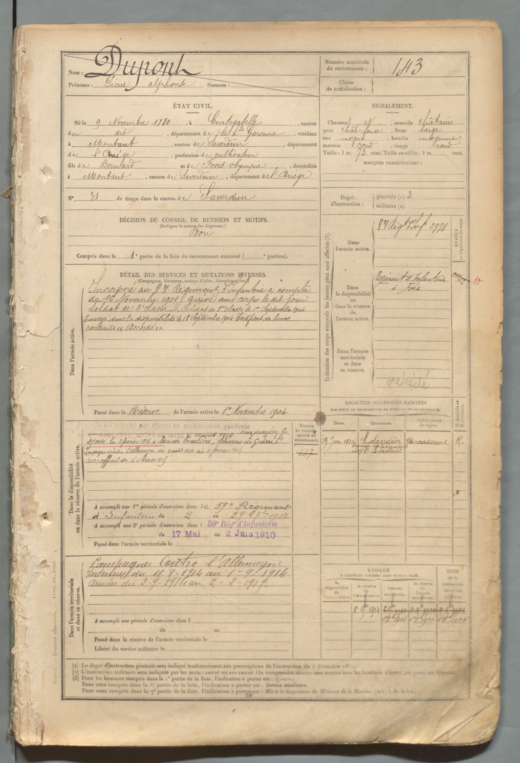 | Dupont | Pierre Alphonse | FOIX | 129 W 2 | 1900 | Cintegabelle | Montaut | 143 |