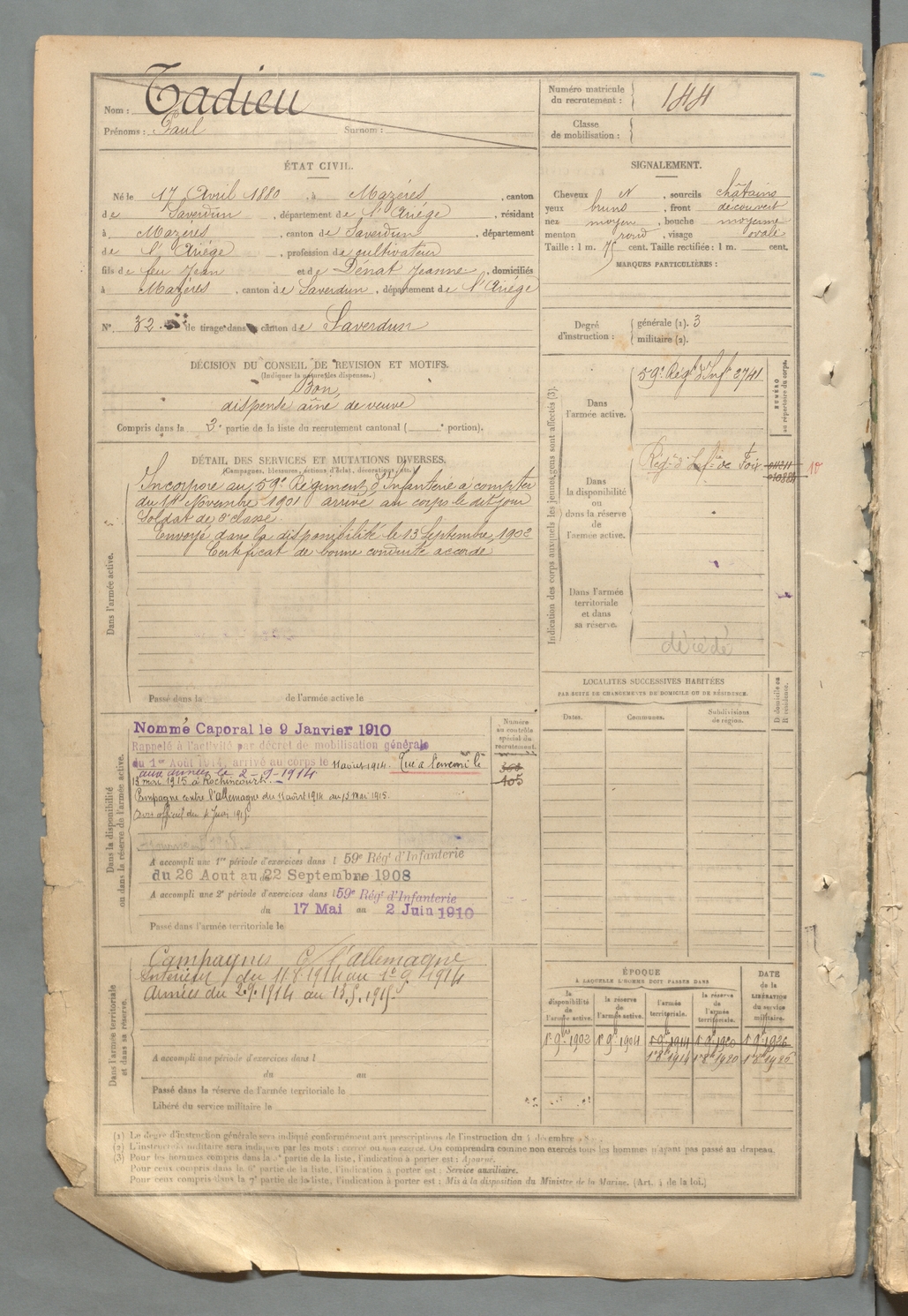 | Tadieu | Paul | FOIX | 129 W 2 | 1900 | Mazères | Mazères | 144 |