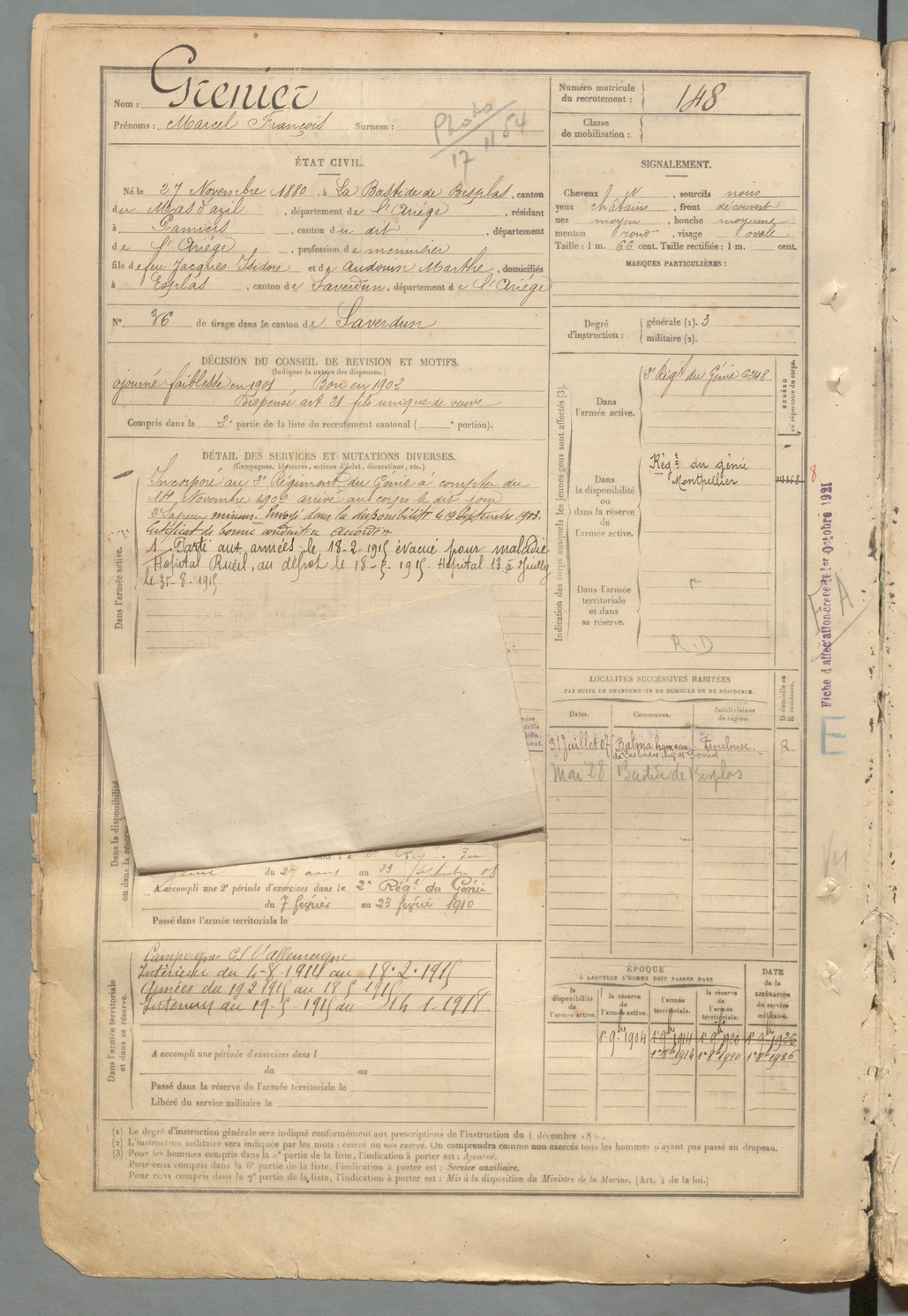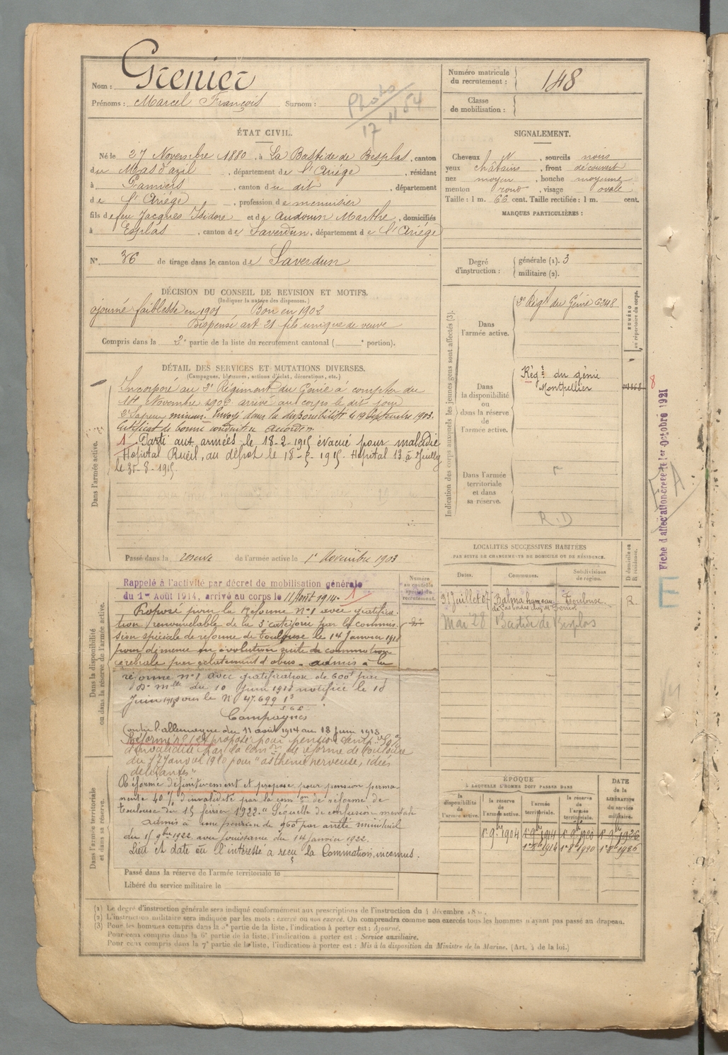 | Grenier | Marcel François | FOIX | 129 W 2 | 1900 | Bastide-de-Besplas (La) | Pamiers | 148 |