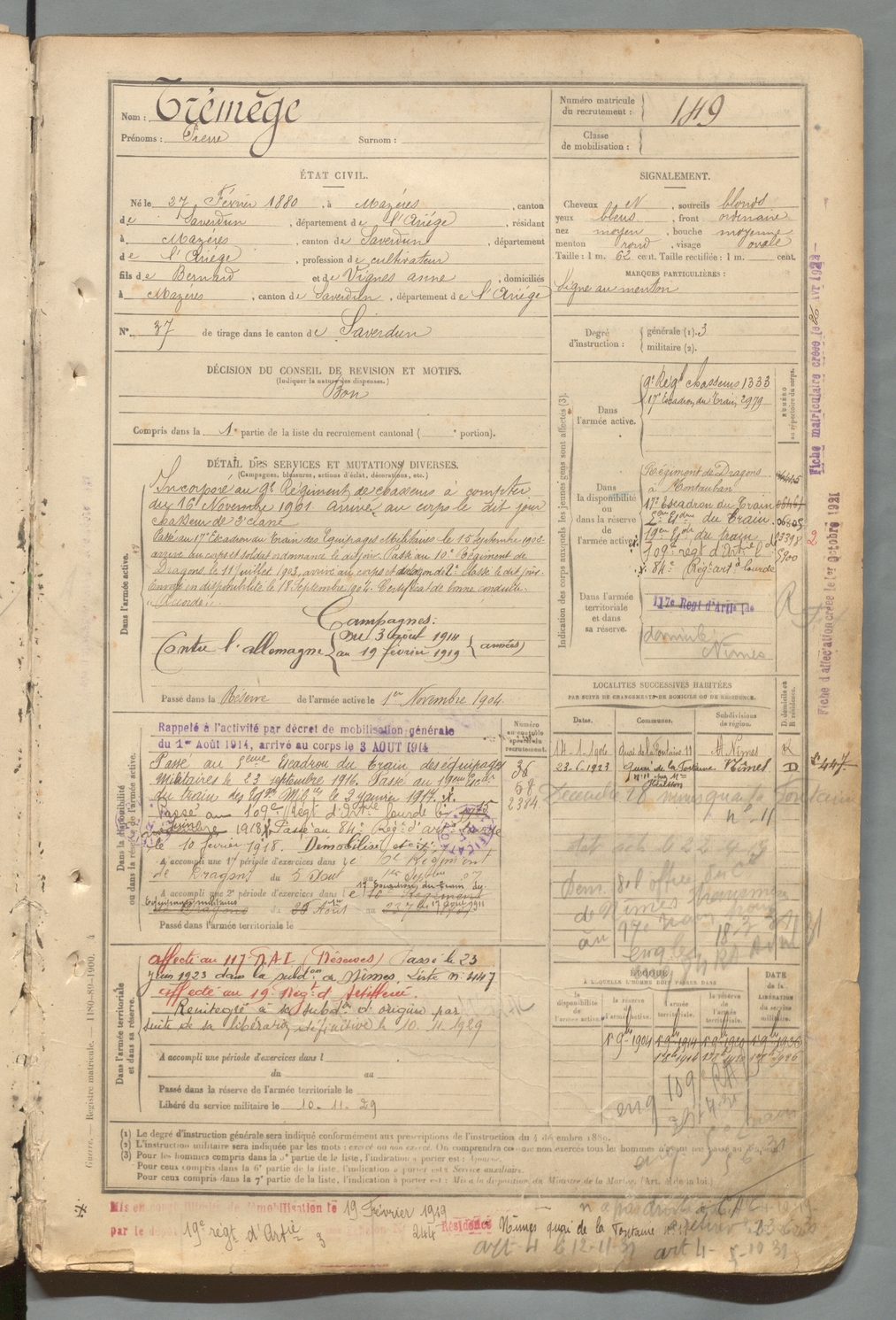 | Trémège | Pierre | FOIX | 129 W 2 | 1900 | Mazères | Mazères | 149 |