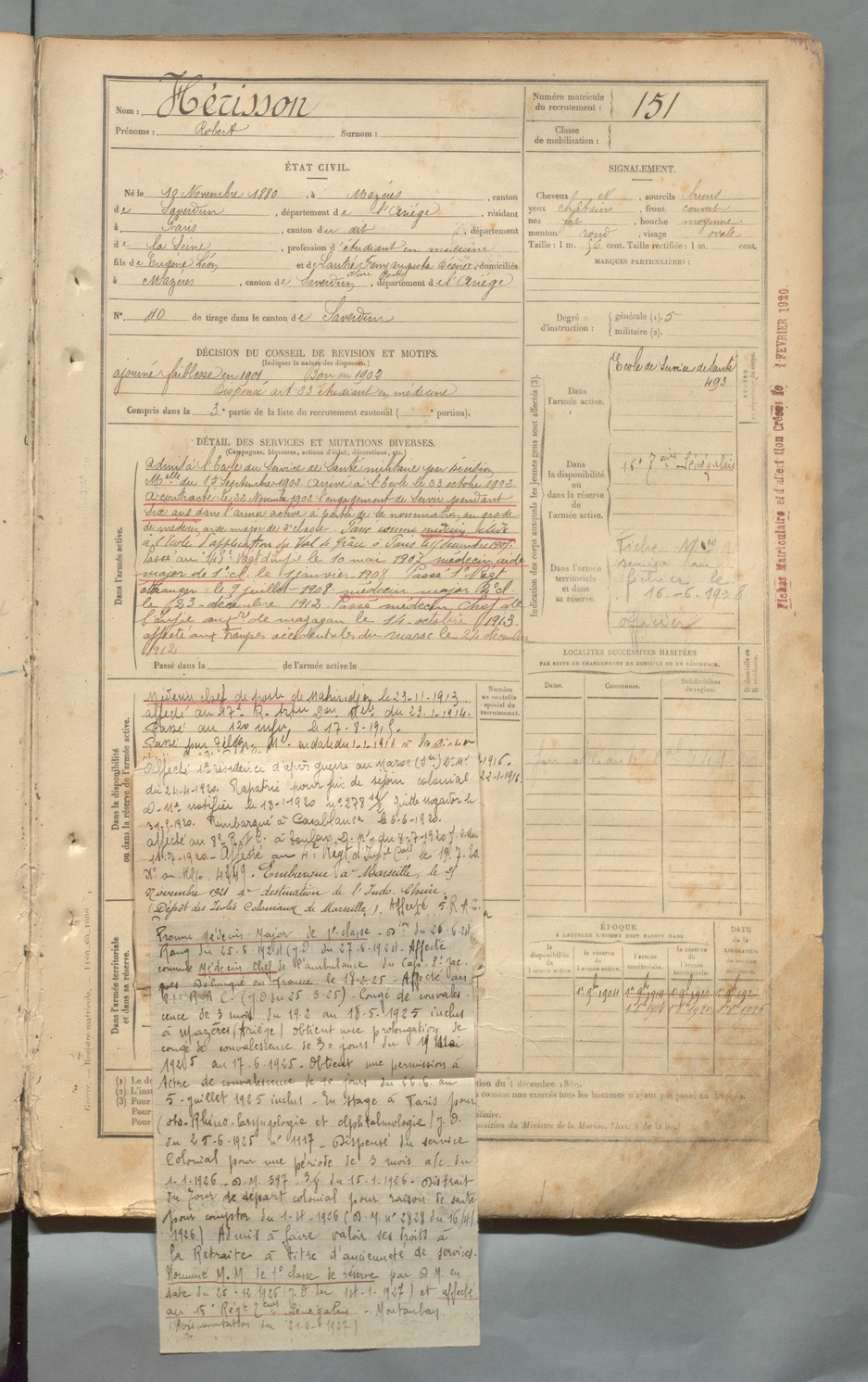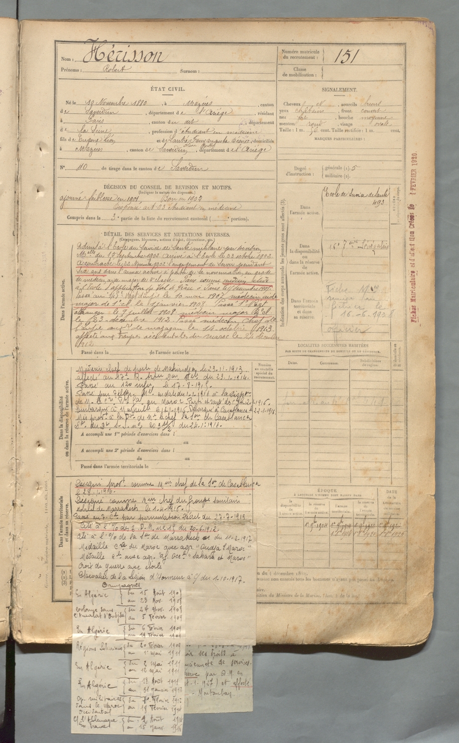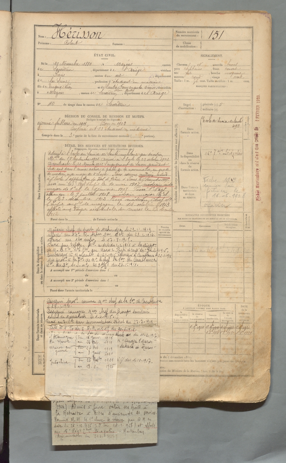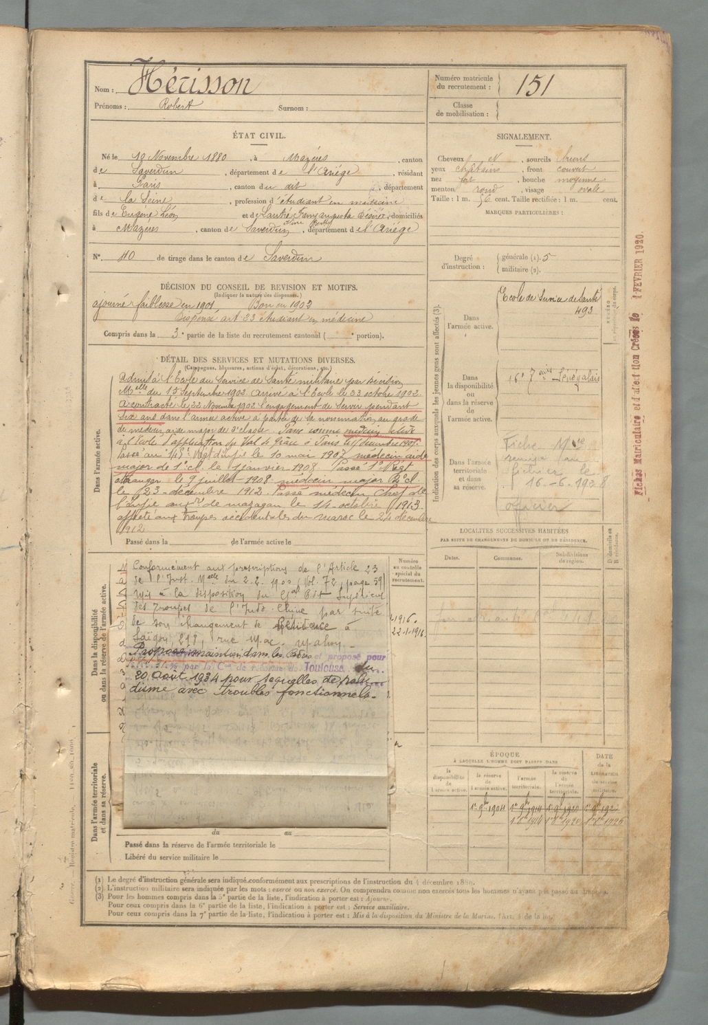 | Hérisson | Robert | FOIX | 129 W 2 | 1900 | Mazères | Paris | 151 |