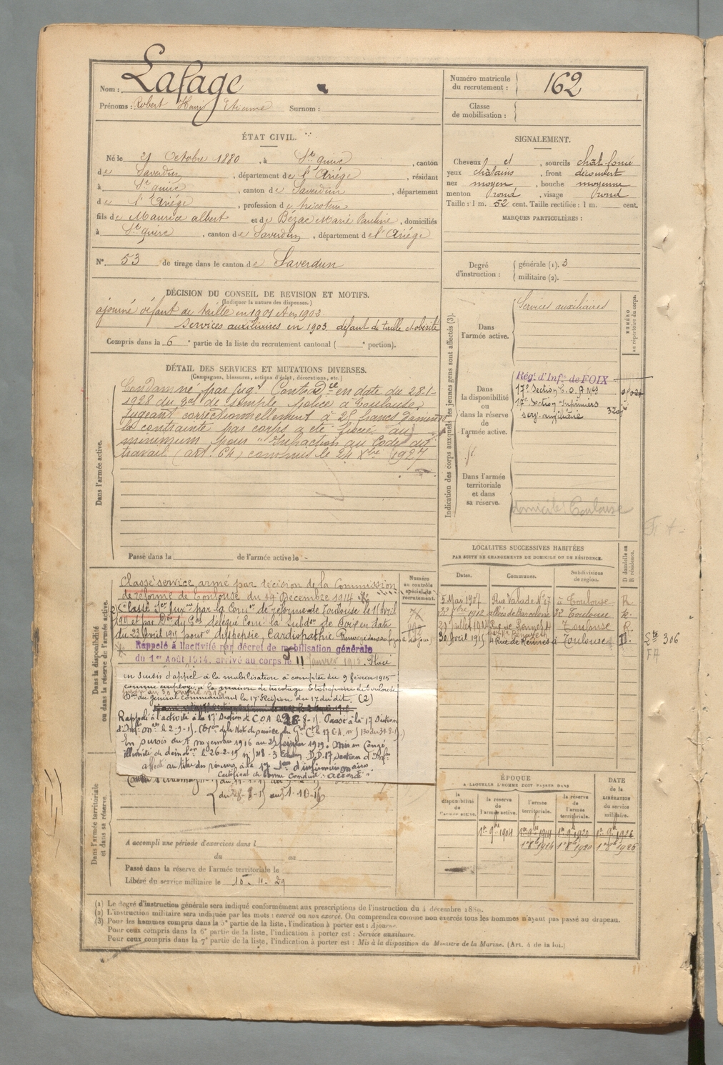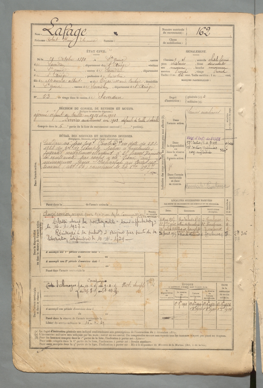 | Lafage | Robert Henri Etienne | FOIX | 129 W 2 | 1900 | Saint-Quirc | Saint-Quirc | 162 |