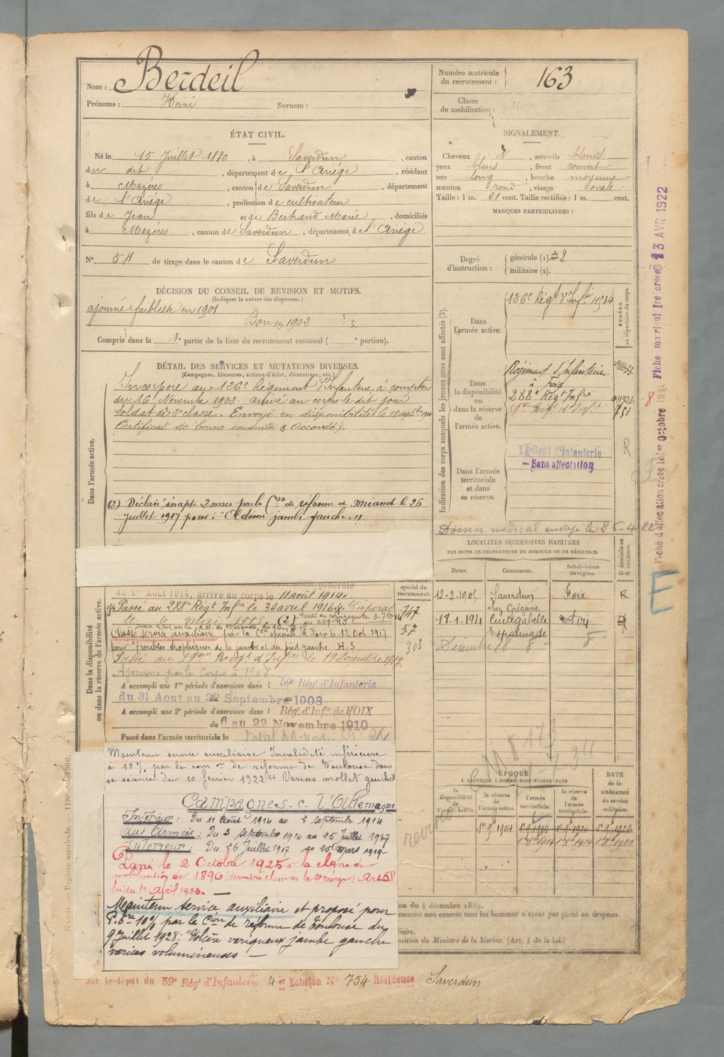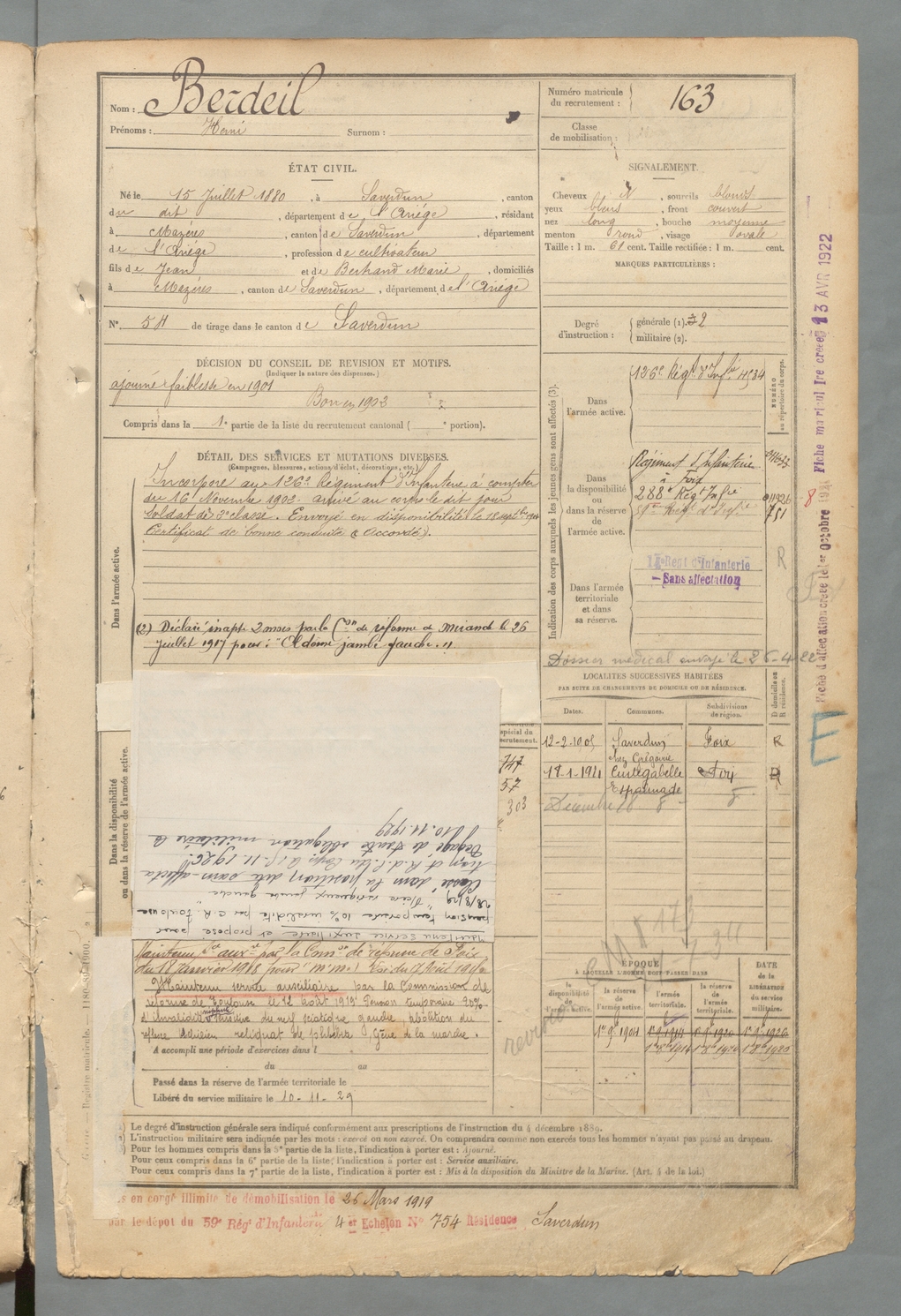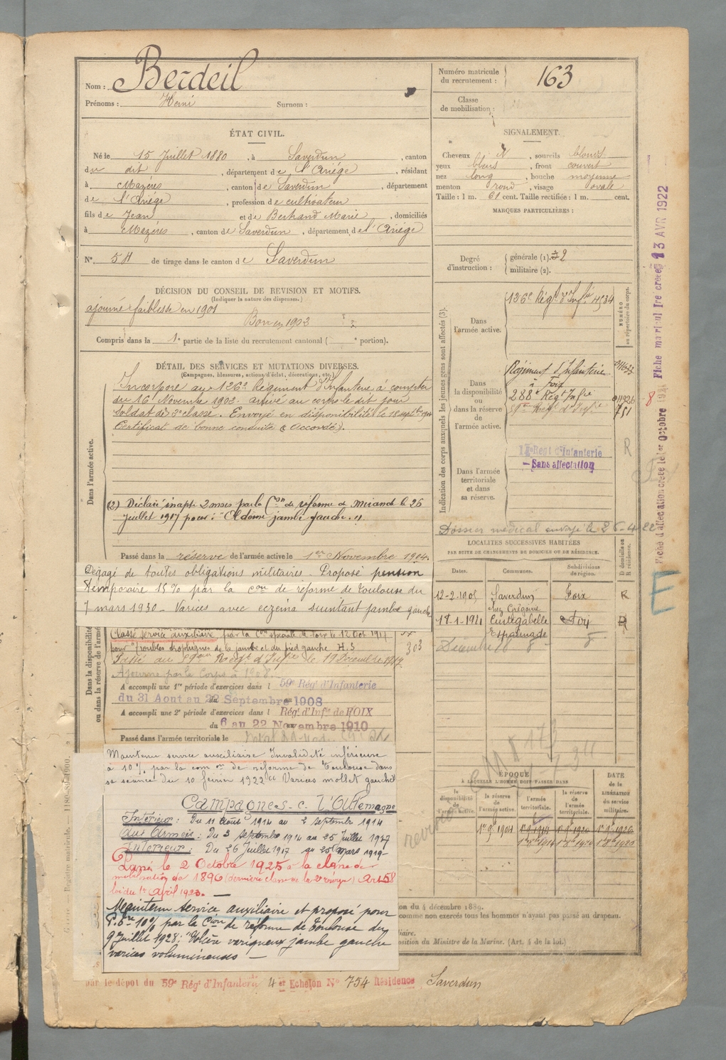 | Berdeil | Henri | FOIX | 129 W 2 | 1900 | Saverdun | Mazères | 163 |
