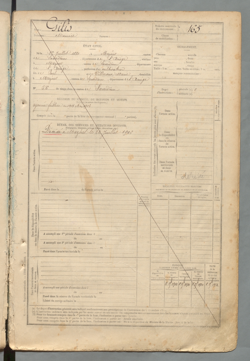 | Gilis | Maurice | FOIX | 129 W 2 | 1900 | Mazères | Mazères | 165 |