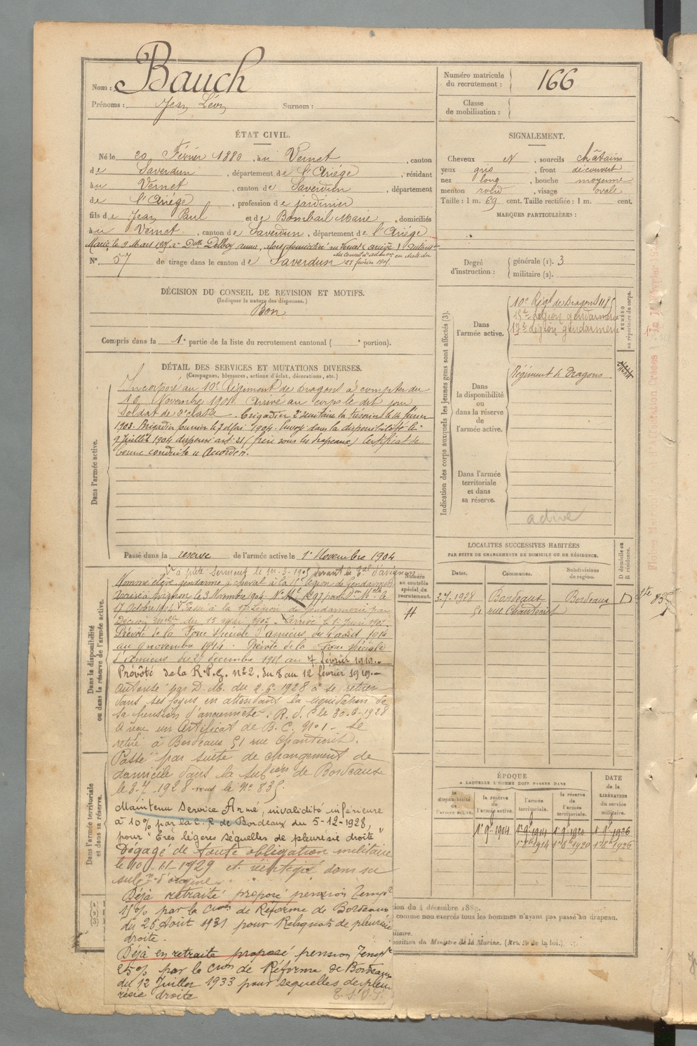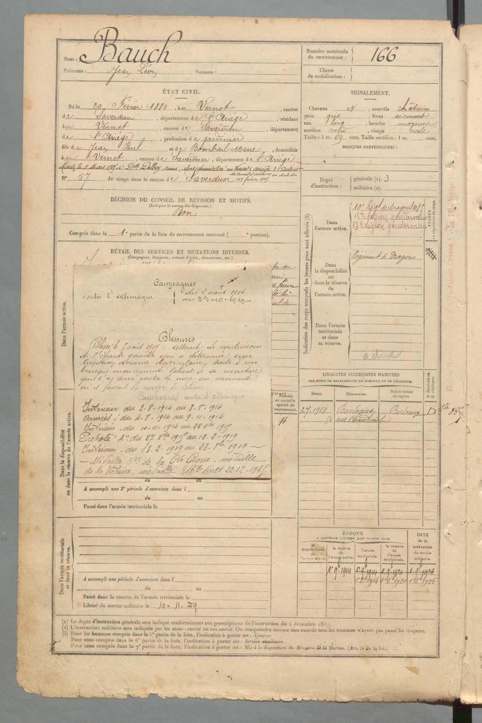 | Bauch | Jean Léon | FOIX | 129 W 2 | 1900 | Vernet (Le) | Vernet (Le) | 166 |