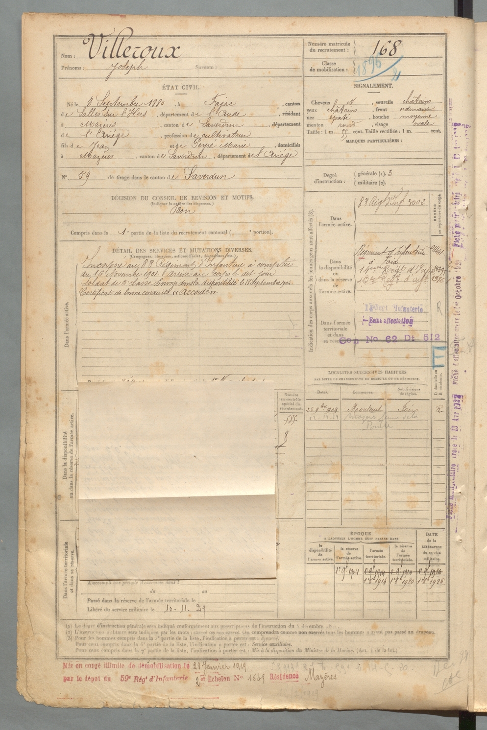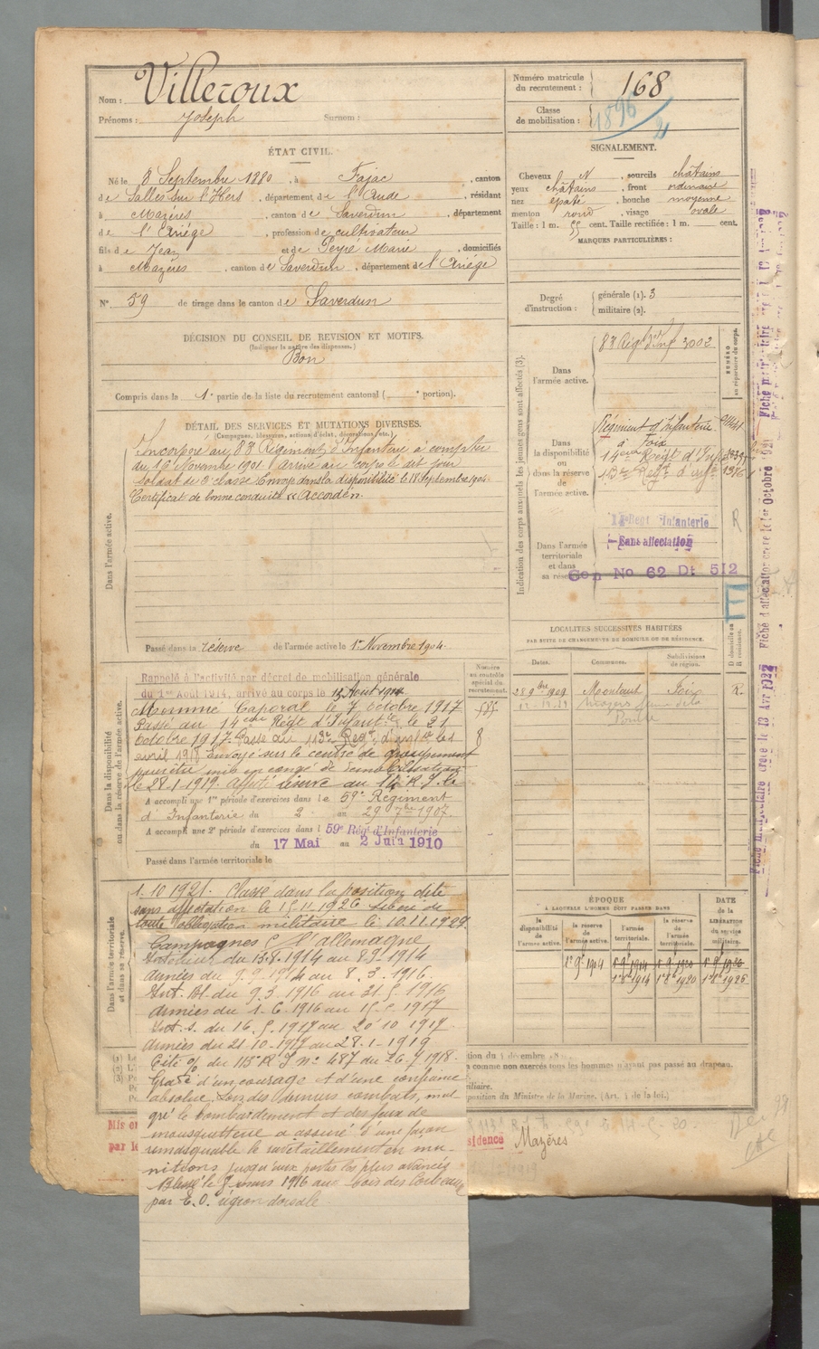 | Villeroux | Joseph | FOIX | 129 W 2 | 1900 | Fajac | Mazères | 168 |