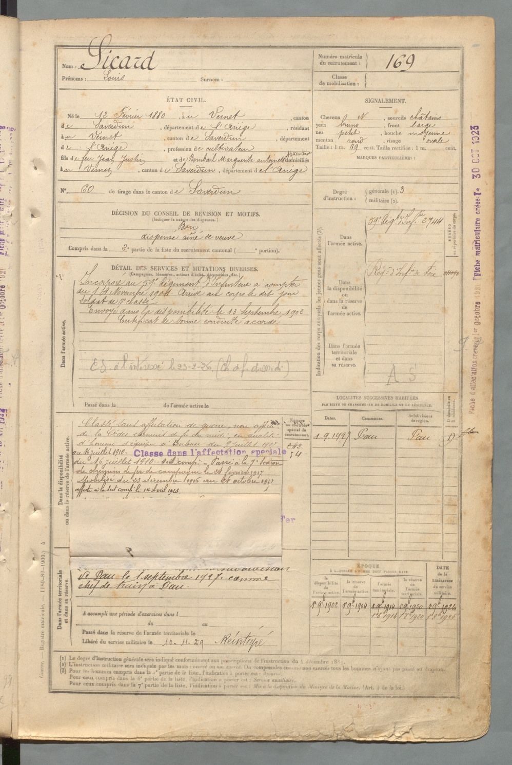 | Sicard | Louis | FOIX | 129 W 2 | 1900 | Vernet (Le) | Vernet (Le) | 169 |