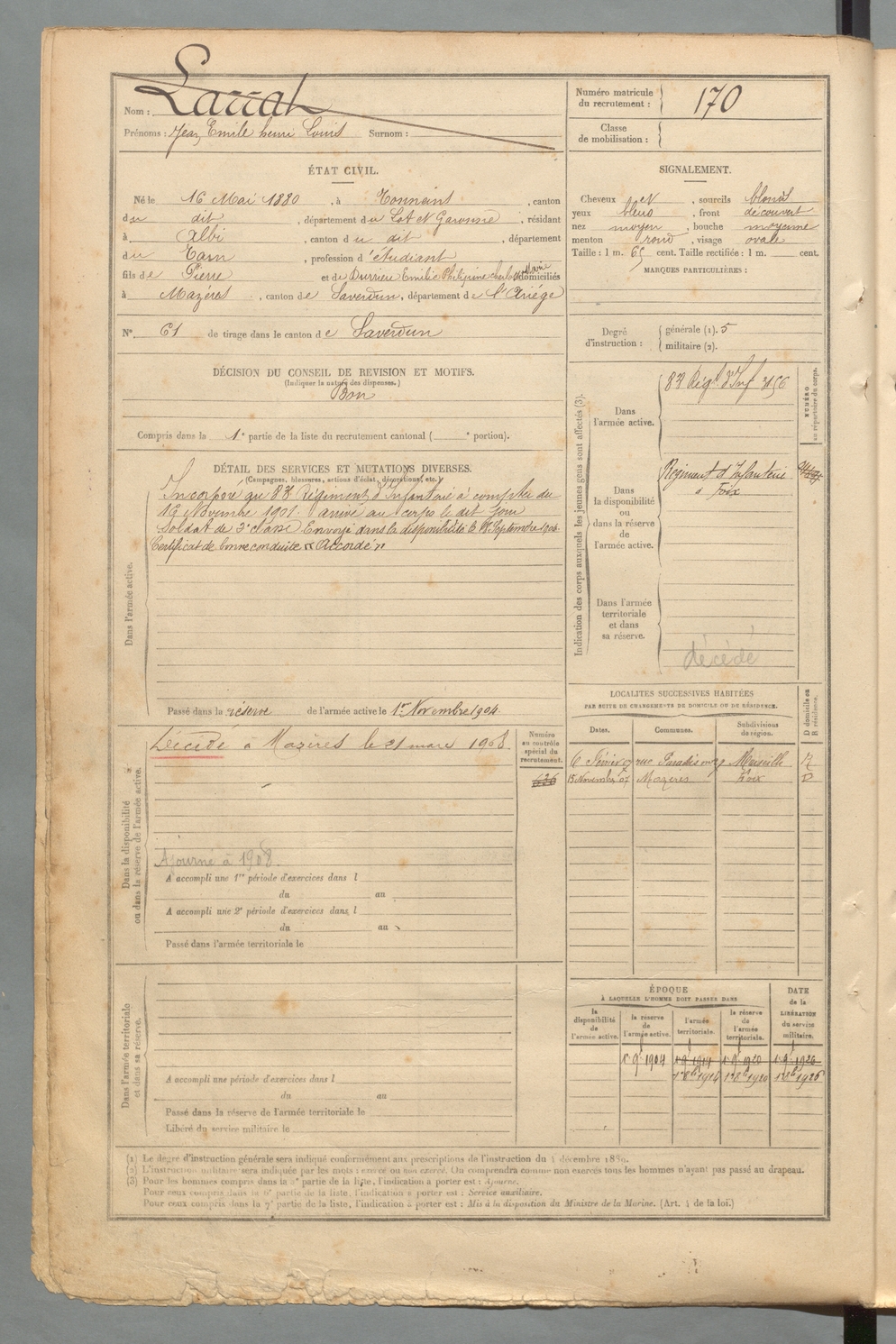 | Larrat | Jean Emile Henri Louis | FOIX | 129 W 2 | 1900 | Tonneins | Albi | 170 |