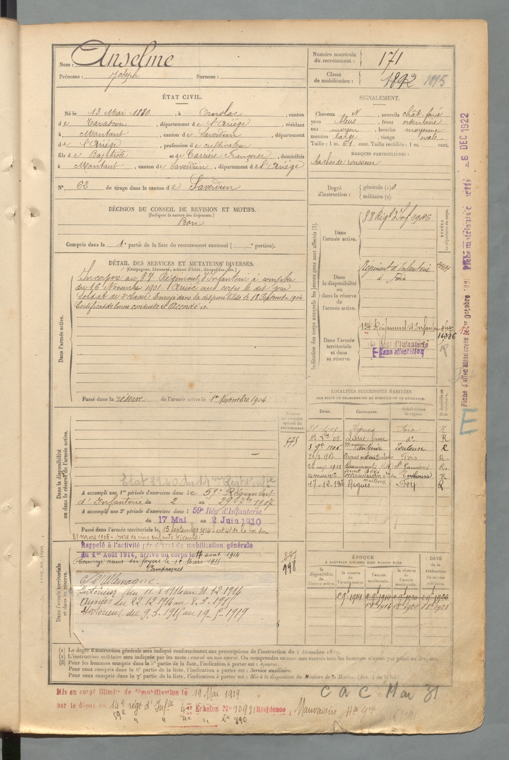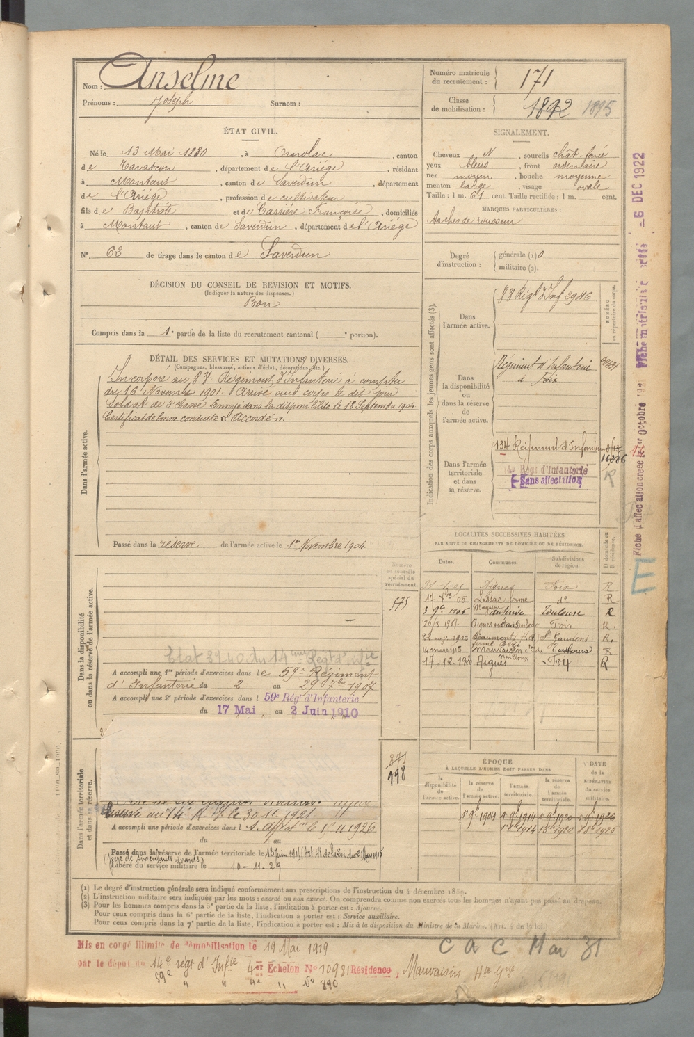 | Anselme | Joseph | FOIX | 129 W 2 | 1900 | Ornolac-Ussat-les-Bains | Montaut | 171 |