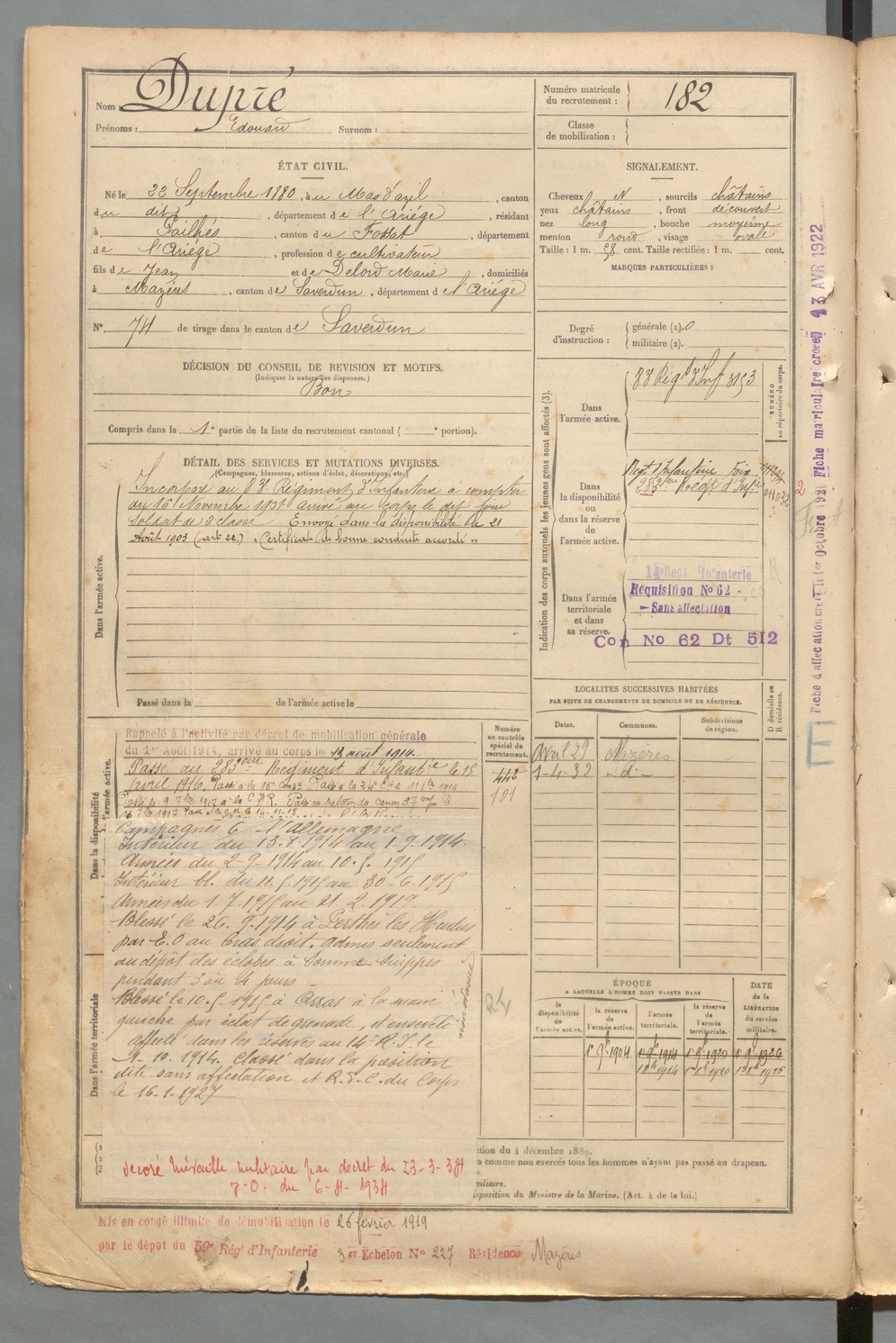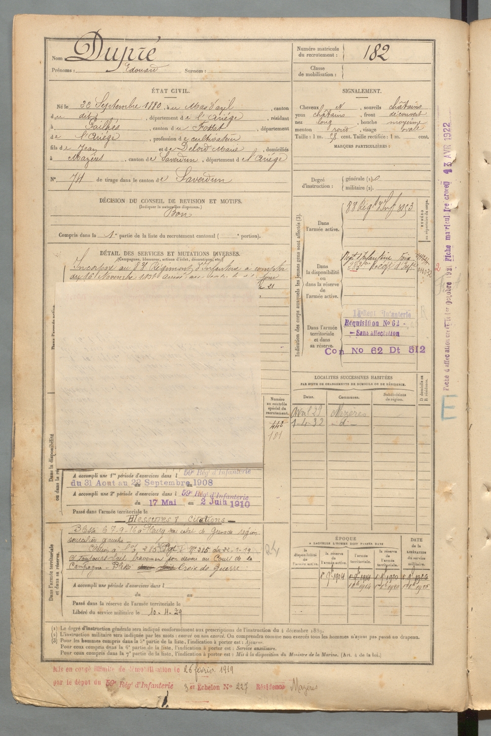| Dupré | Edouard | FOIX | 129 W 2 | 1900 | Mas-d'Azil (Le) | Pailhès | 182 |