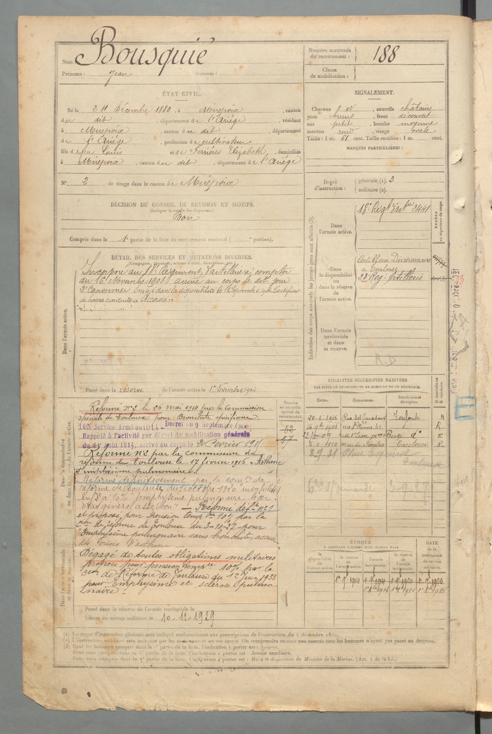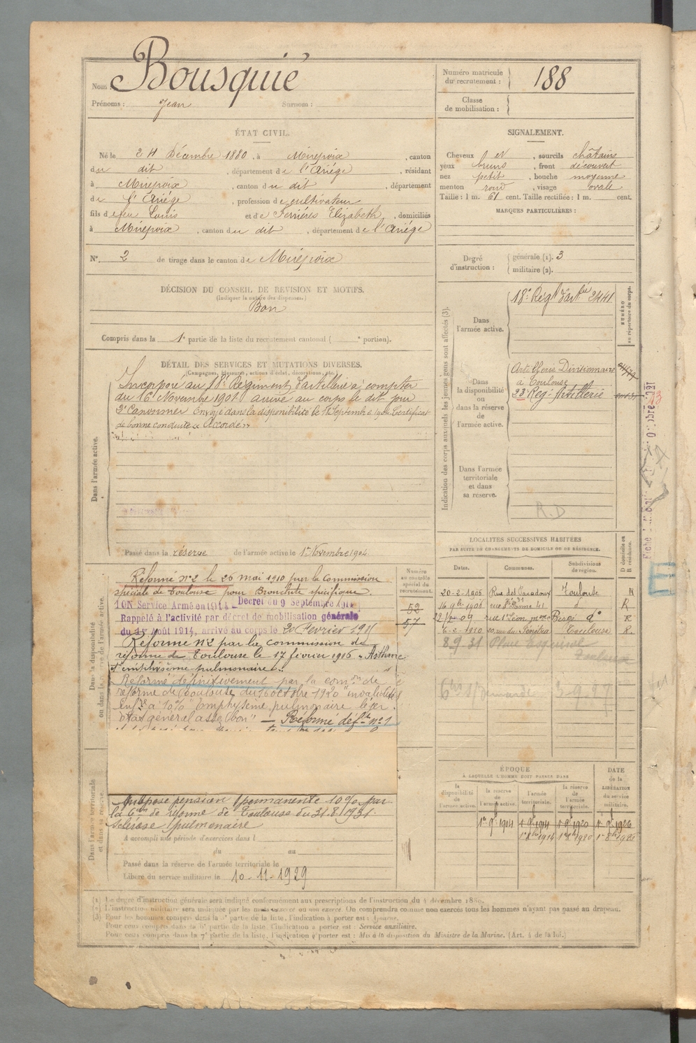 | Bousquié | Jean | FOIX | 129 W 2 | 1900 | Mirepoix | Mirepoix | 188 |
