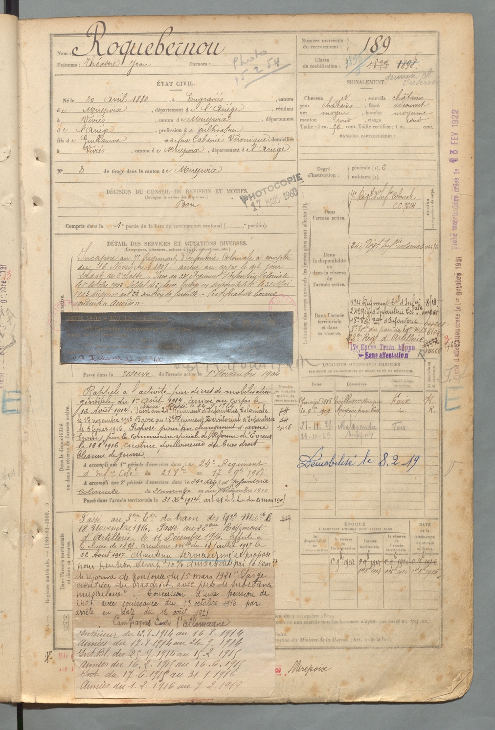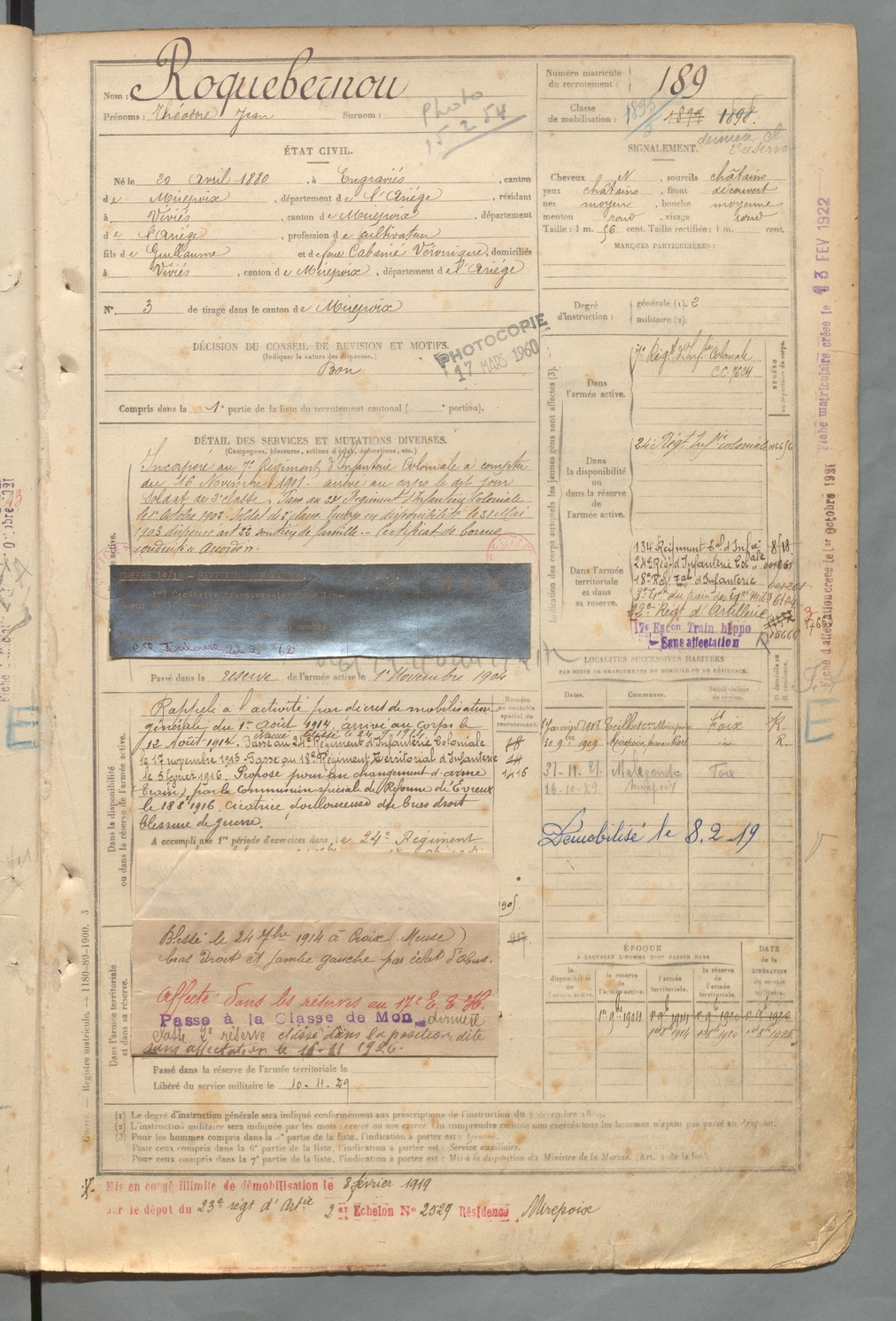 | Roquebernou | Théodore Jean | FOIX | 129 W 2 | 1900 | Engraviès | Viviès | 189 |
