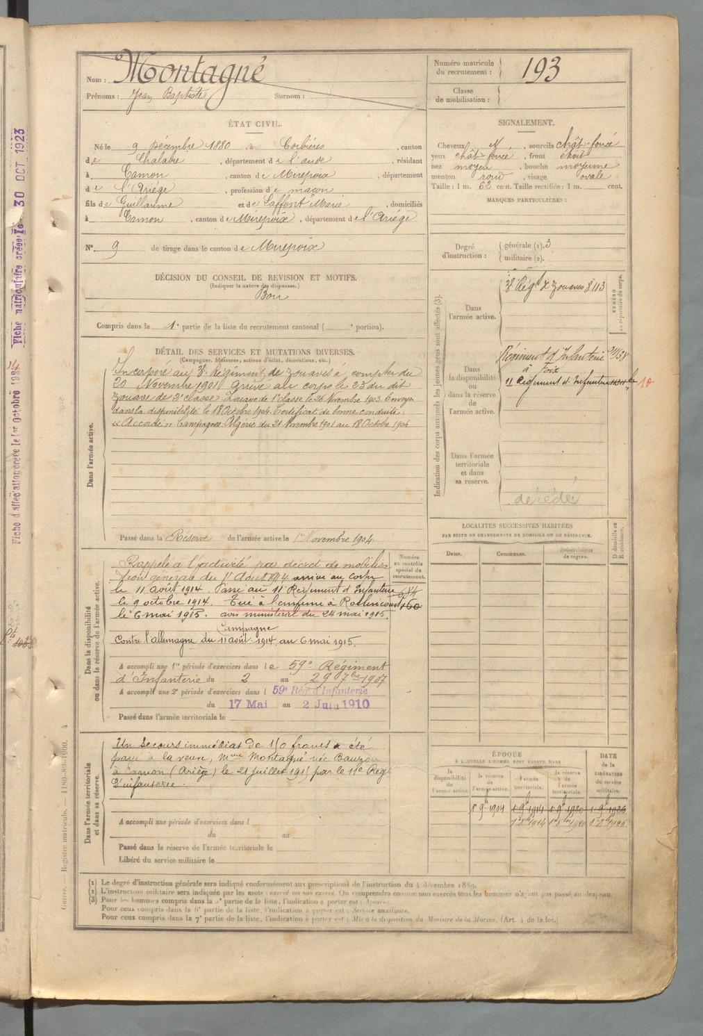 | Montagné | Jean Baptiste | FOIX | 129 W 2 | 1900 | Corbières | Camon | 193 |
