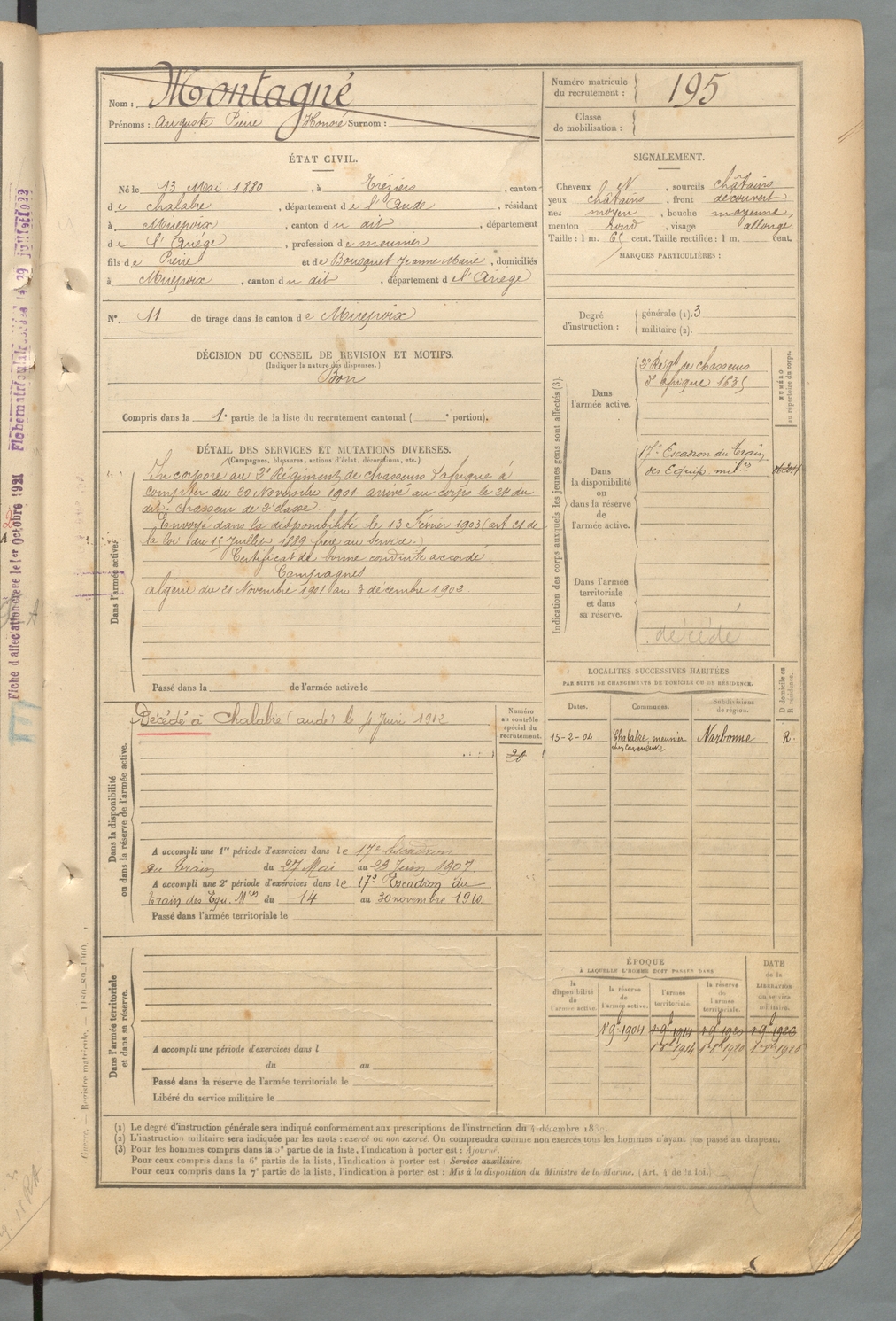 | Montagné | Auguste Pierre Honoré | FOIX | 129 W 2 | 1900 | Tréziers | Mirepoix | 195 |