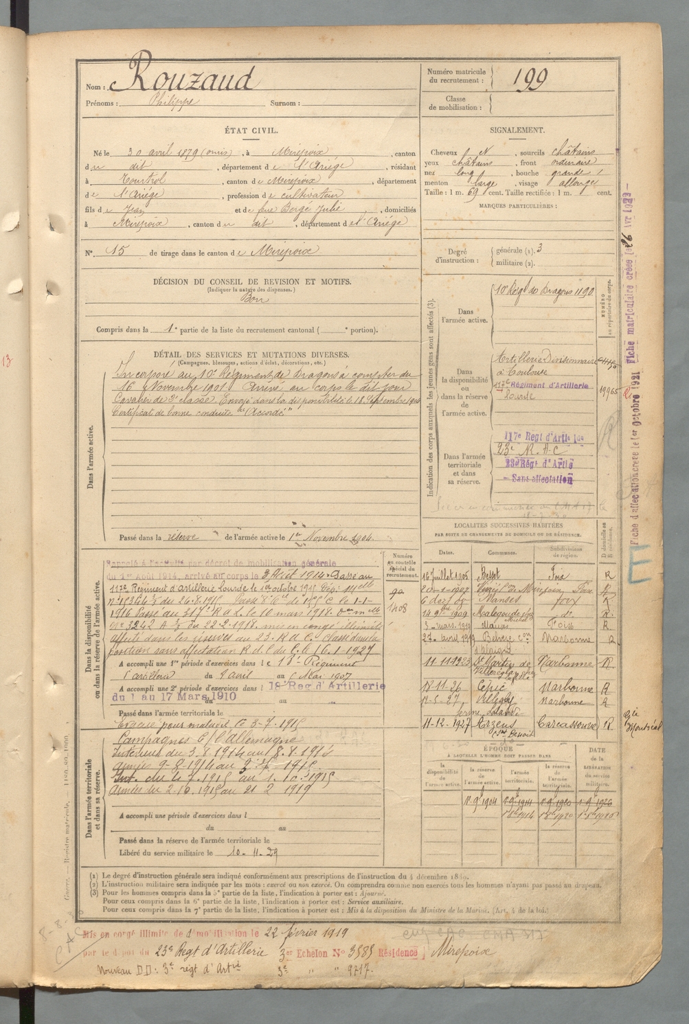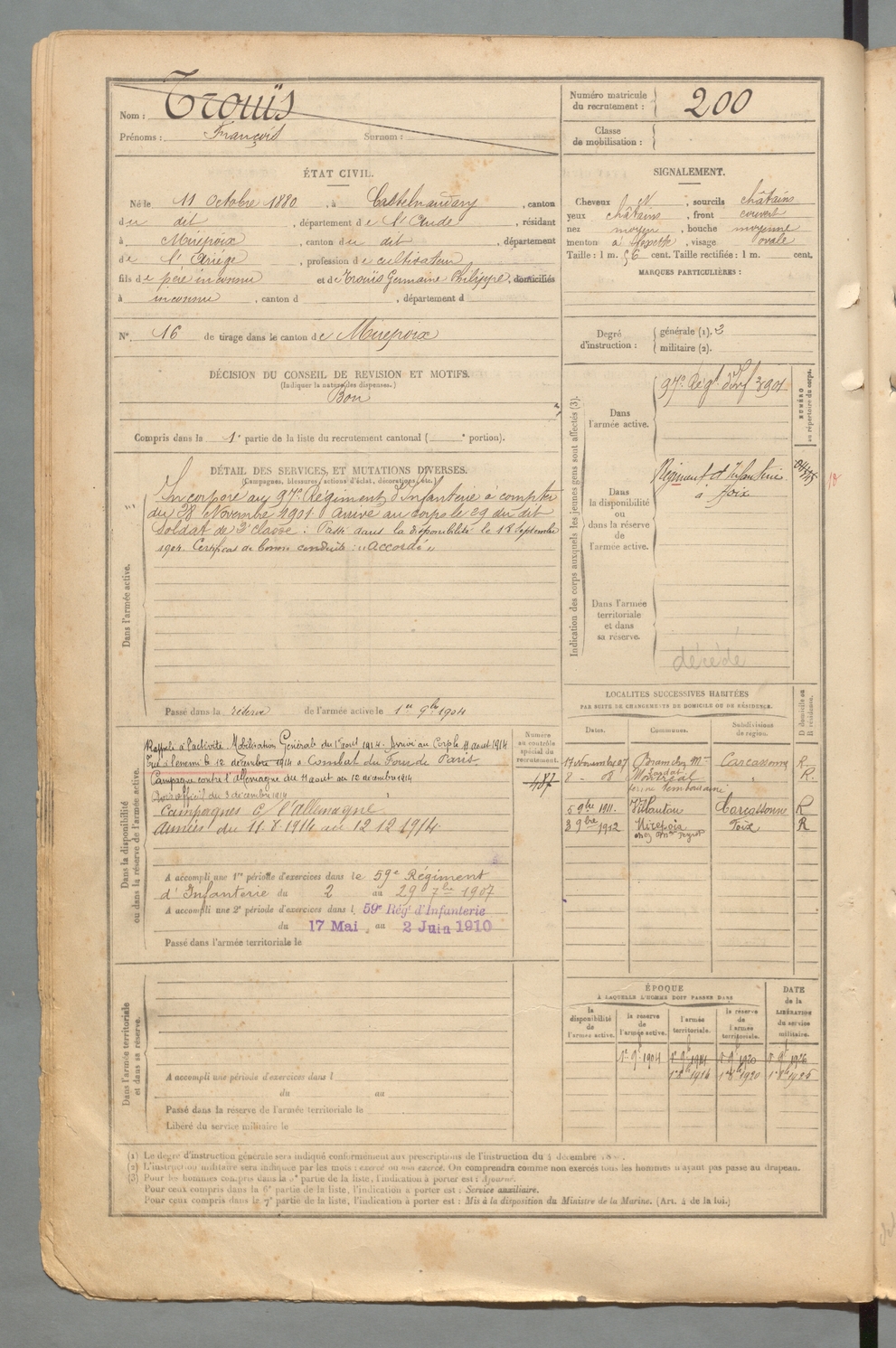 | Trouïs | François | FOIX | 129 W 2 | 1900 | Castelnaudary | Mirepoix | 200 |