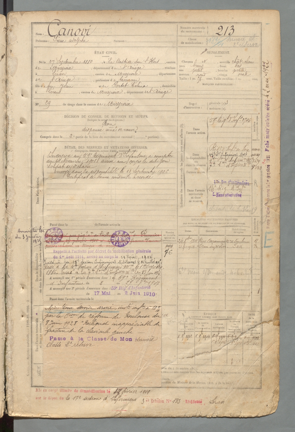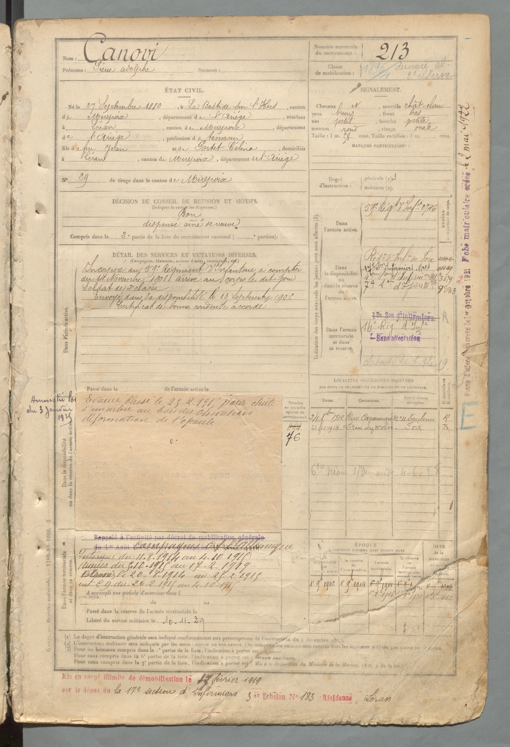 | Canovi | Pierre Adolphe | FOIX | 129 W 2 | 1900 | Bastide-sur-l'Hers (La) | Léran | 213 |