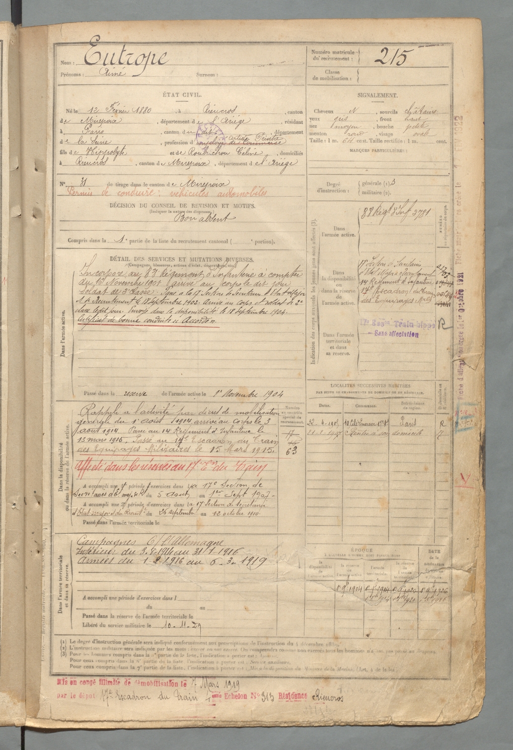 | Eutrope | Aimé | FOIX | 129 W 2 | 1900 | Rieucros | Paris | 215 |