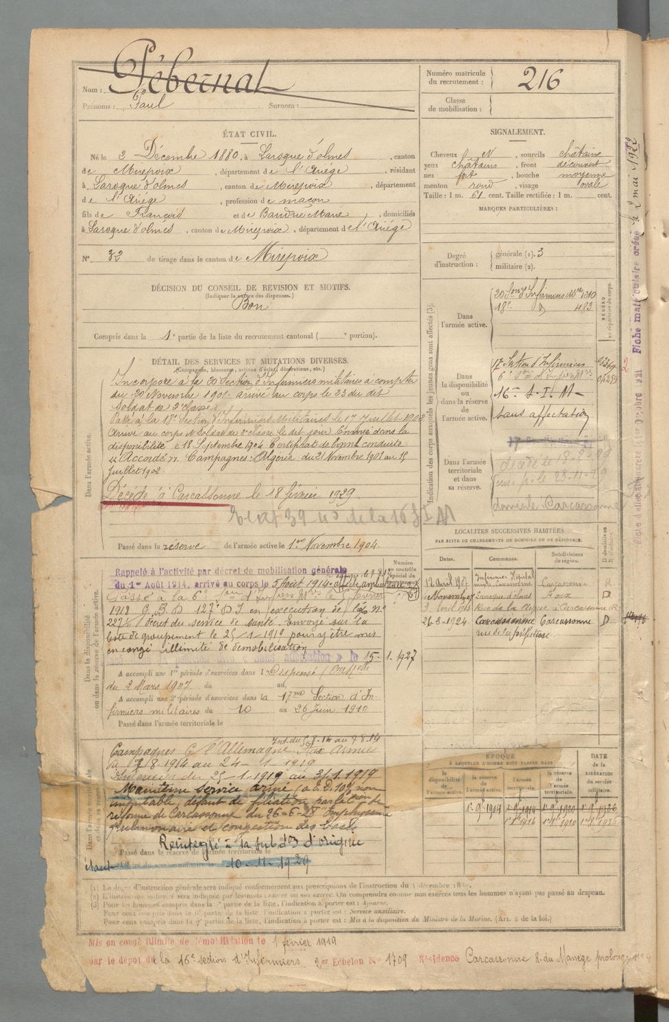 | Pébernat | Paul | FOIX | 129 W 2 | 1900 | Laroque-d'Olmes | Laroque-d'Olmes | 216 |
