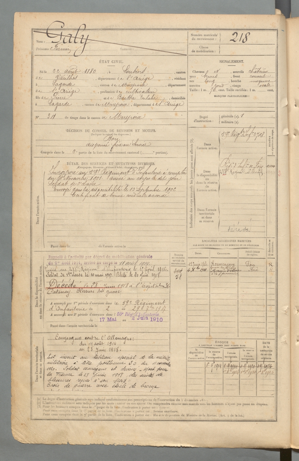 | Galy | Firmin | FOIX | 129 W 2 | 1900 | Loubens | Lagarde | 218 |