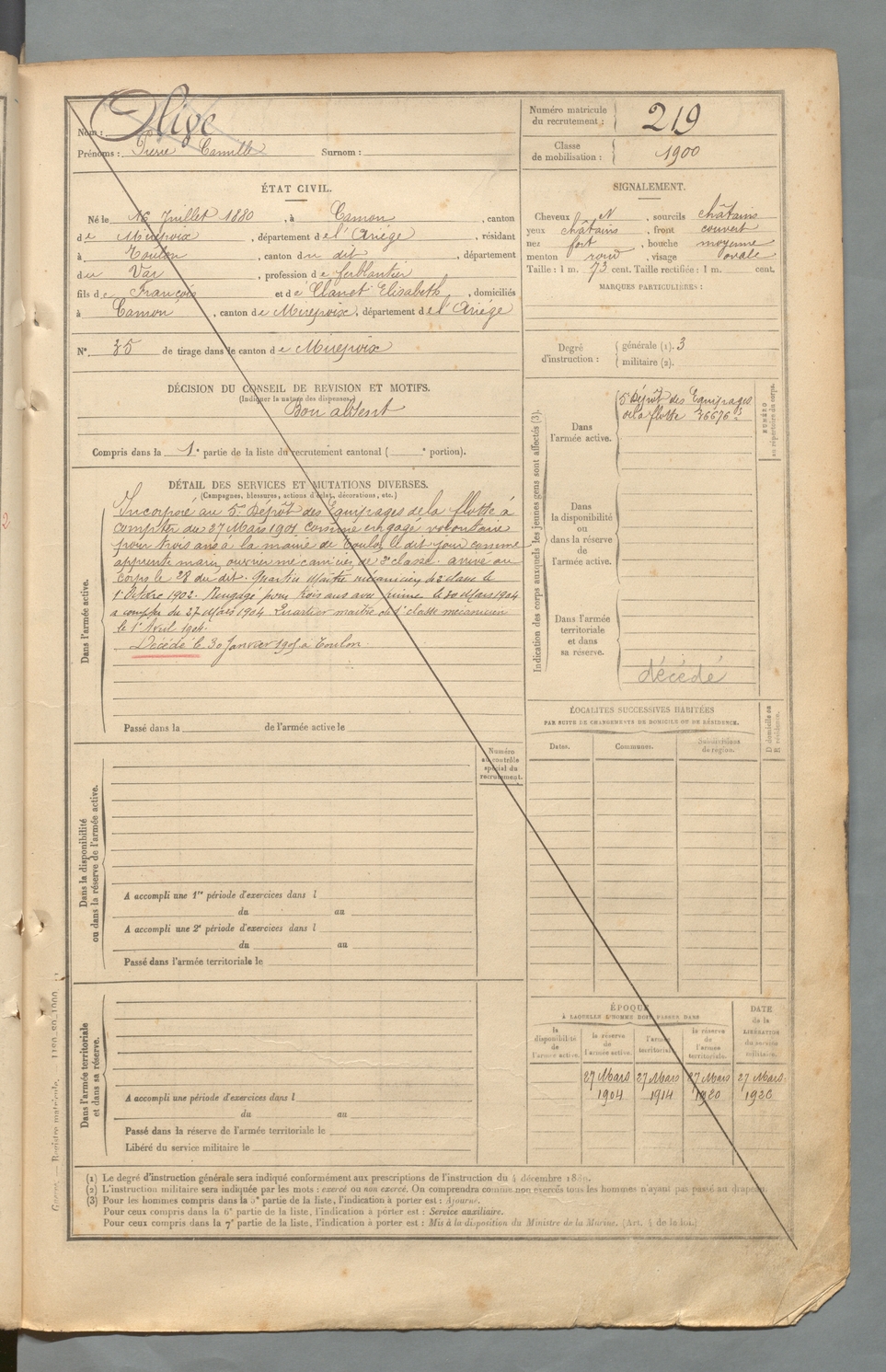 | Olive | Pierre Camille | FOIX | 129 W 2 | 1900 | Camon | Toulon | 219 |