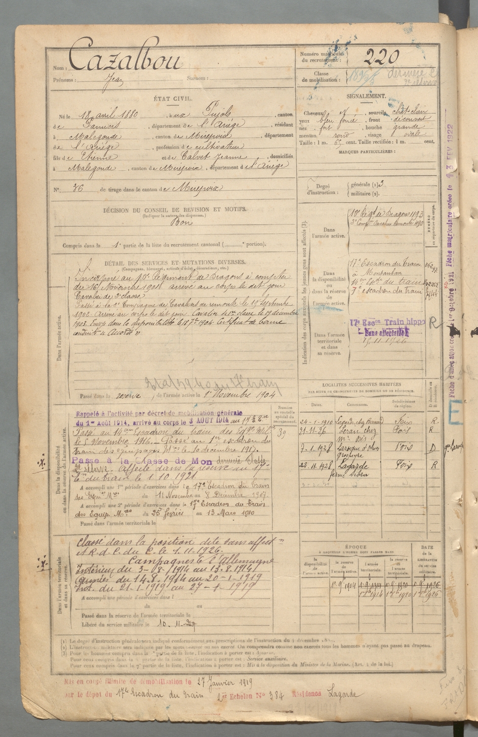 | Cazalbou | Jean | FOIX | 129 W 2 | 1900 | Pujols | Malegoude | 220 |