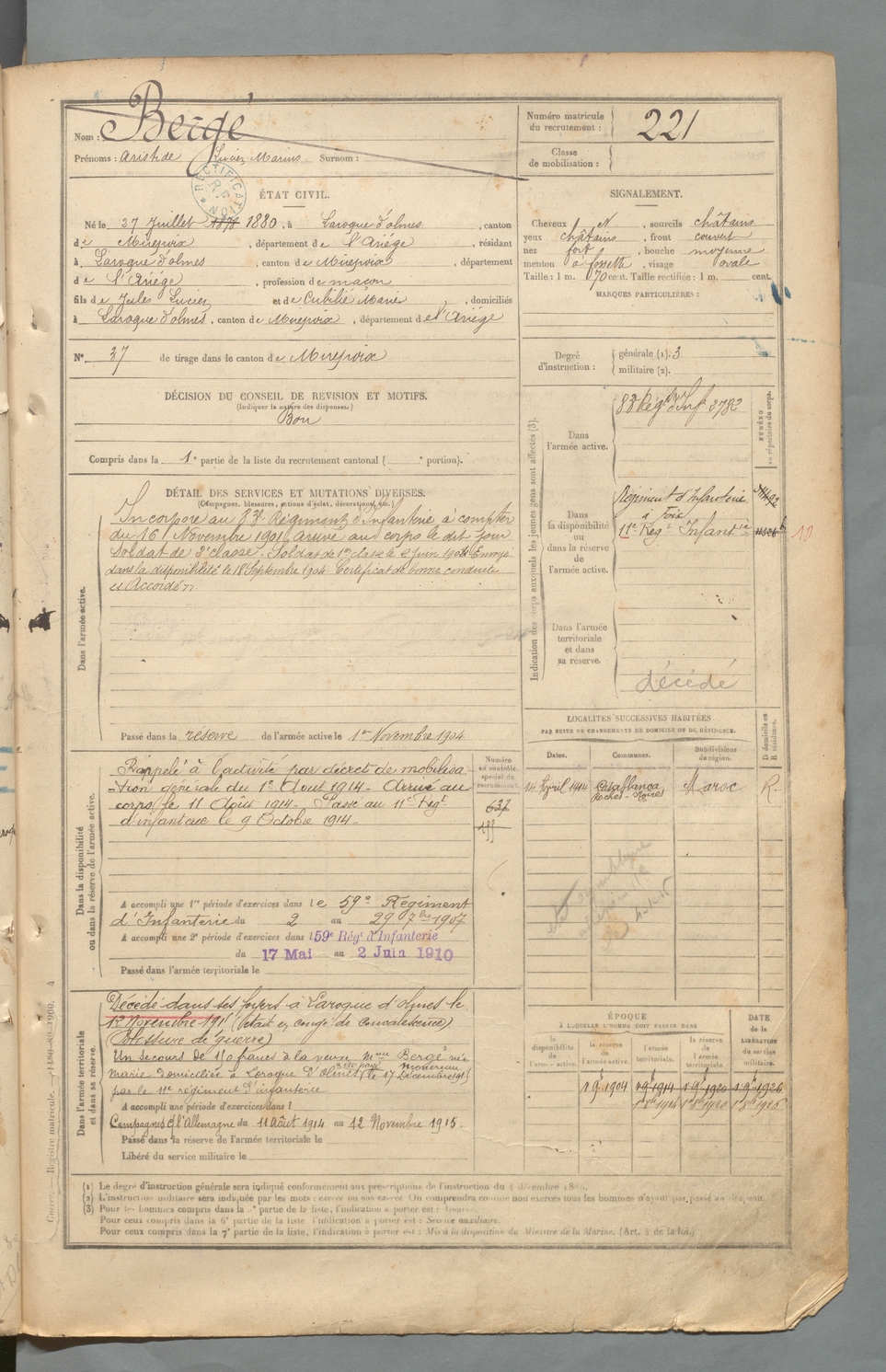 | Bergé | Aristide Lucien Marius | FOIX | 129 W 2 | 1900 | Laroque-d'Olmes | Laroque-d'Olmes | 221 |