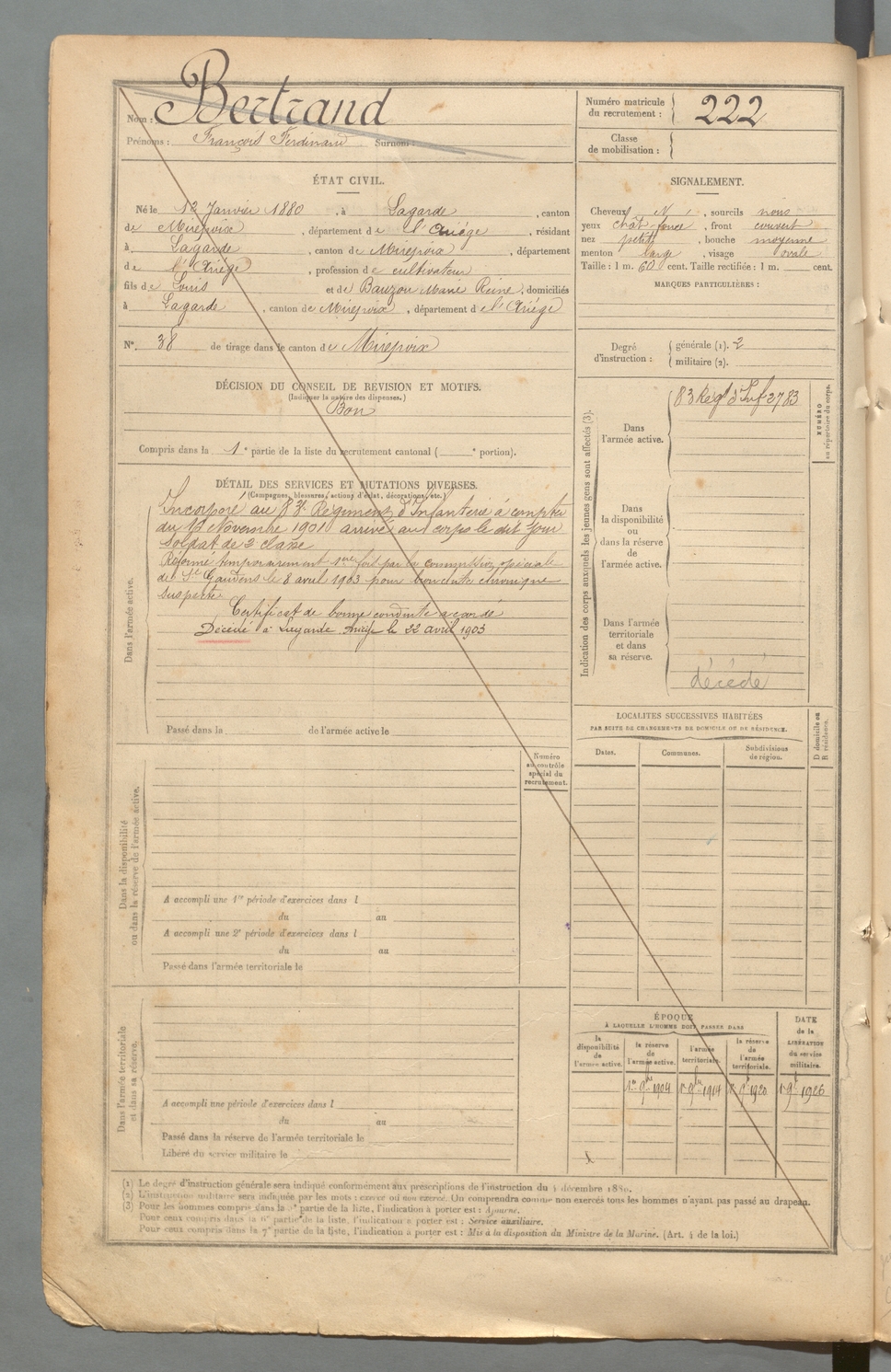 | Bertrand | François Ferdinand | FOIX | 129 W 2 | 1900 | Lagarde | Lagarde | 222 |