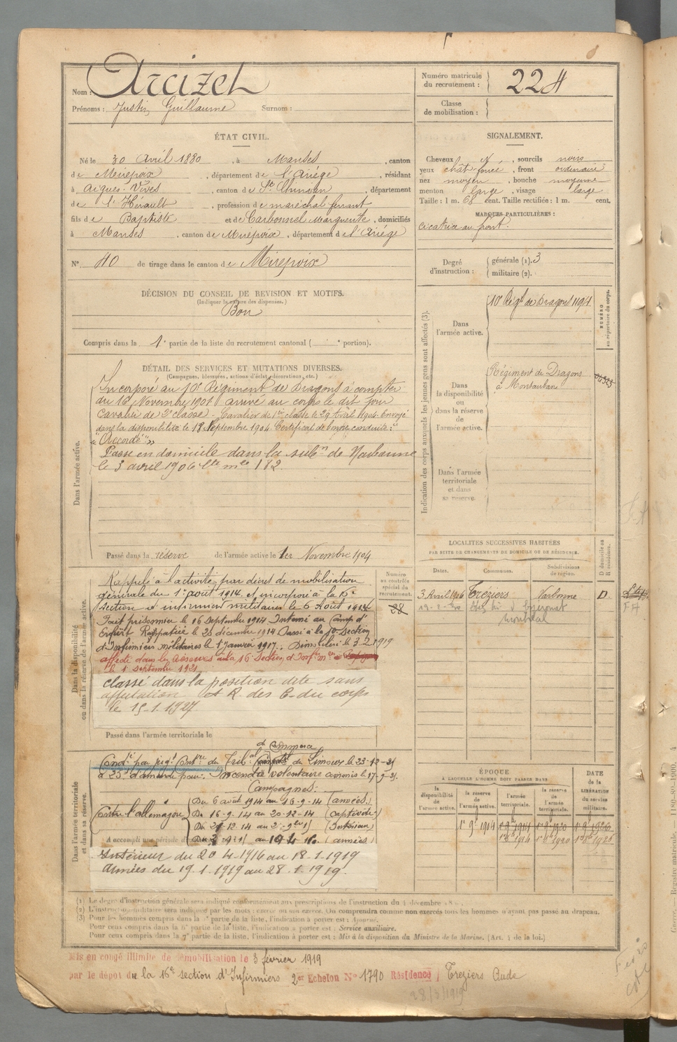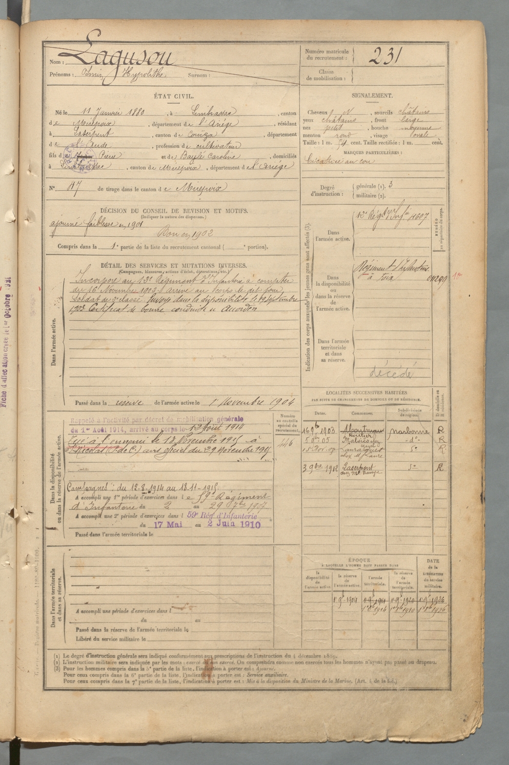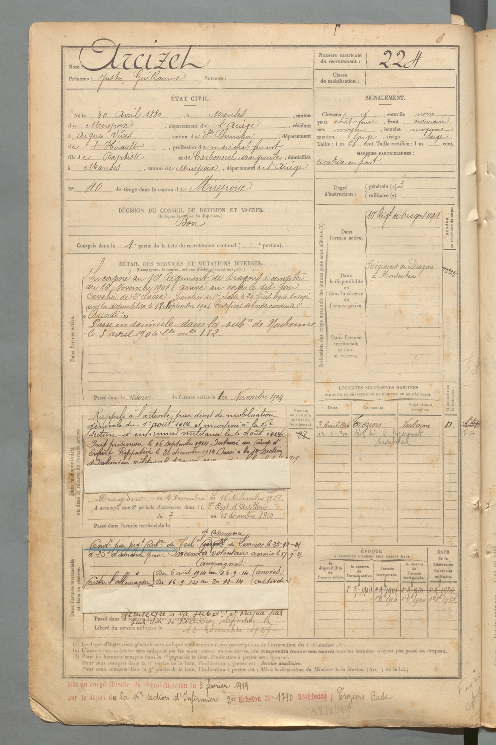 | Arcizet | Justin Guillaume | FOIX | 129 W 2 | 1900 | Manses | Aigues-Vives | 224 |