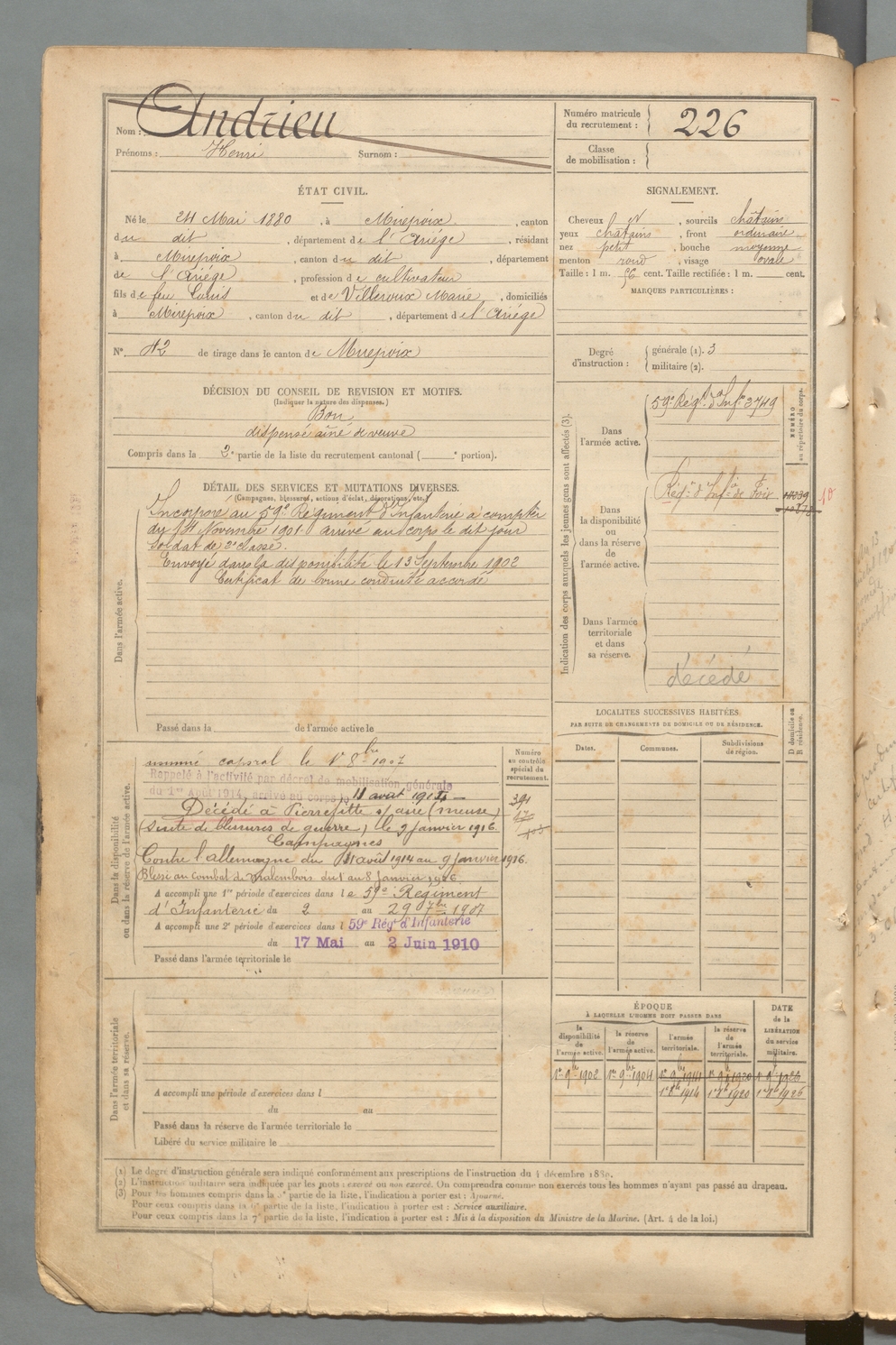 | Andrieu | Henri | FOIX | 129 W 2 | 1900 | Mirepoix | Mirepoix | 226 |