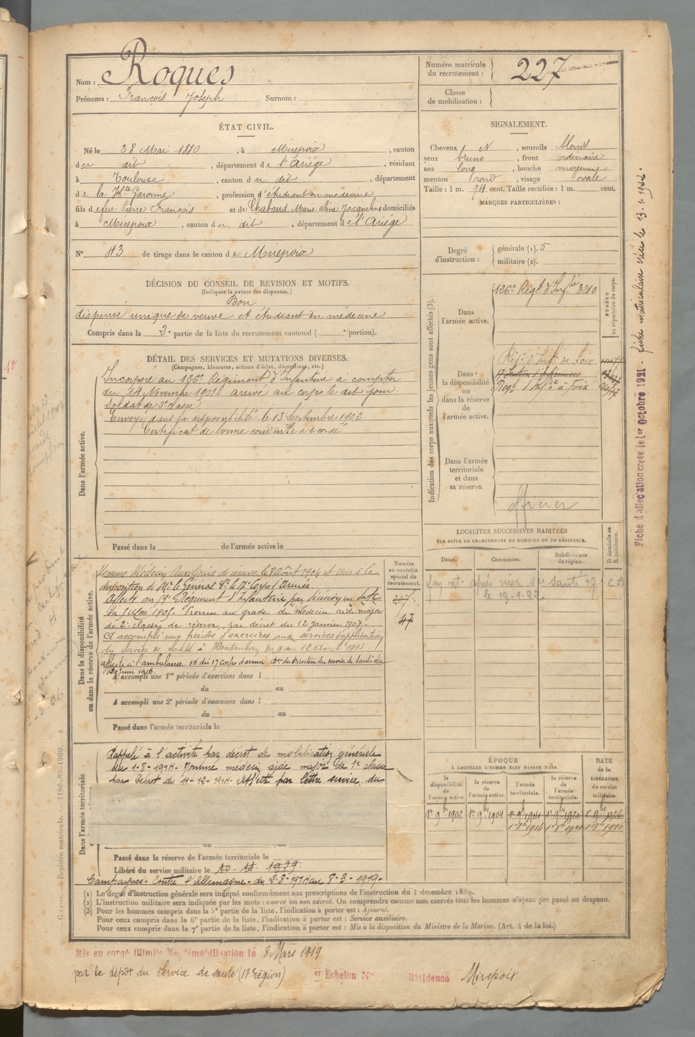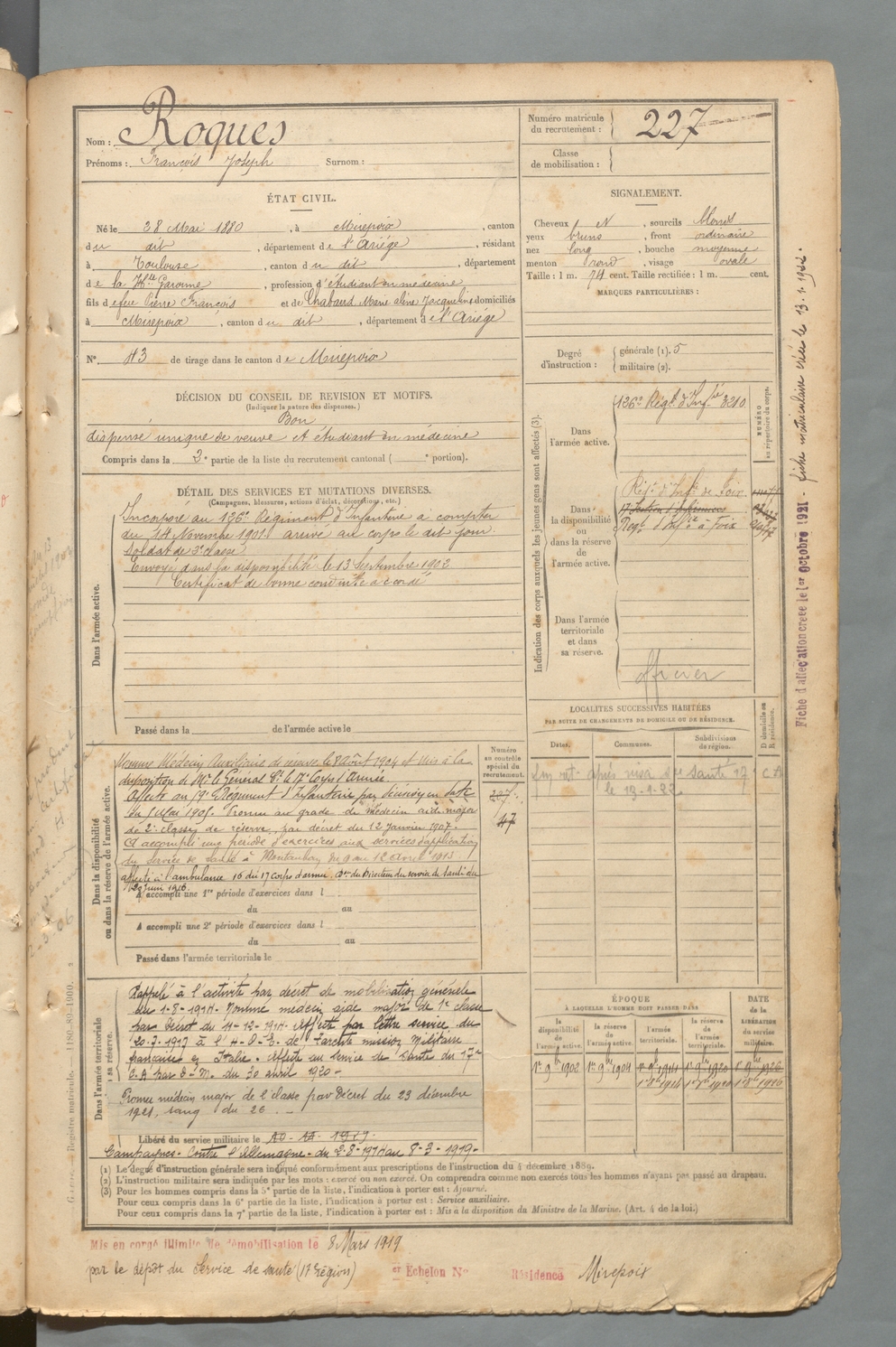 | Roques | François Joseph | FOIX | 129 W 2 | 1900 | Mirepoix | Toulouse | 227 |