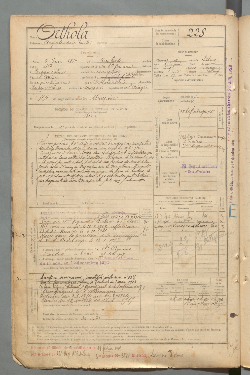 | Orthola | Auguste Marie Emile | FOIX | 129 W 2 | 1900 | Toulouse | Laroque-d'Olmes | 228 |
