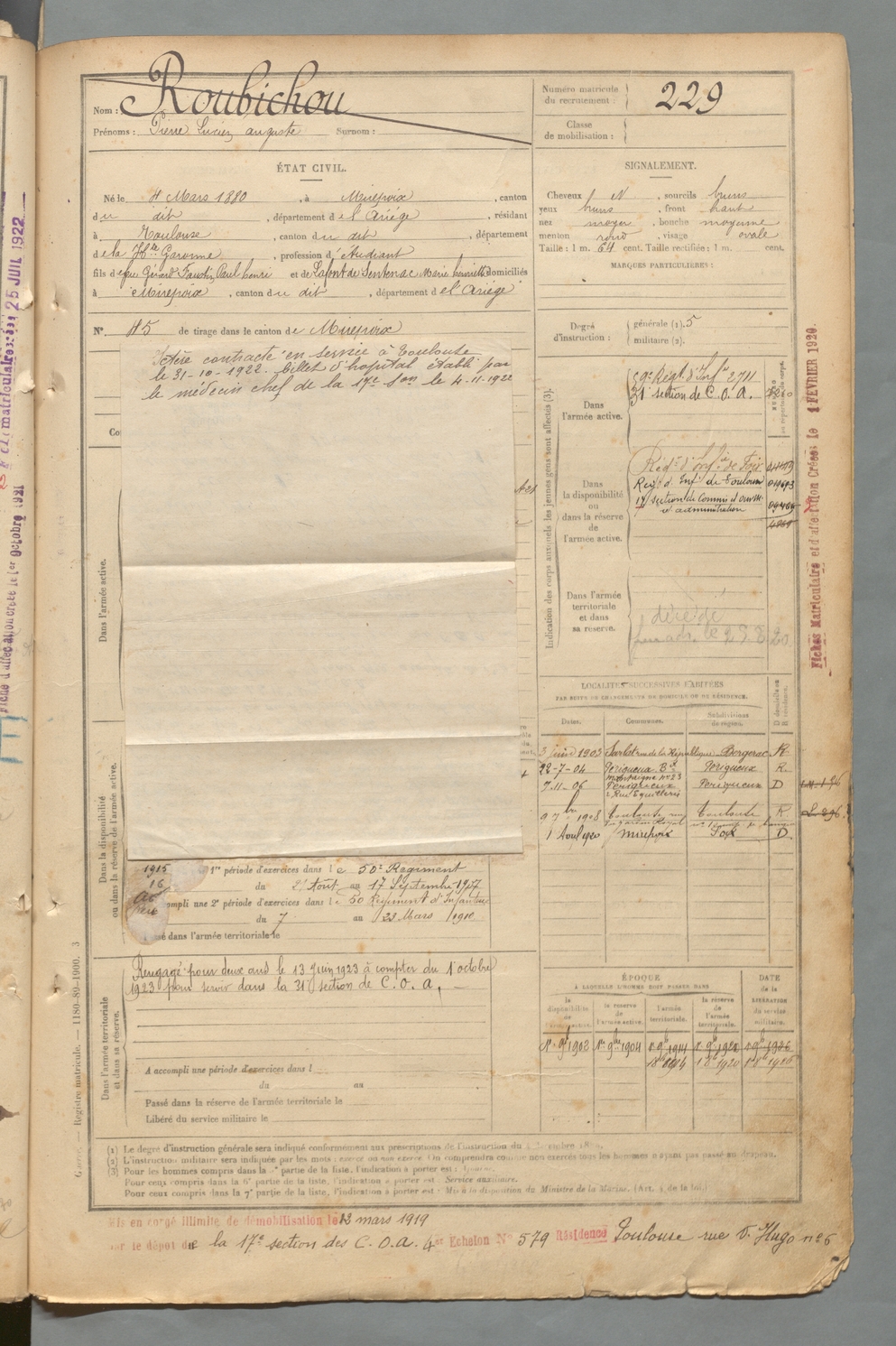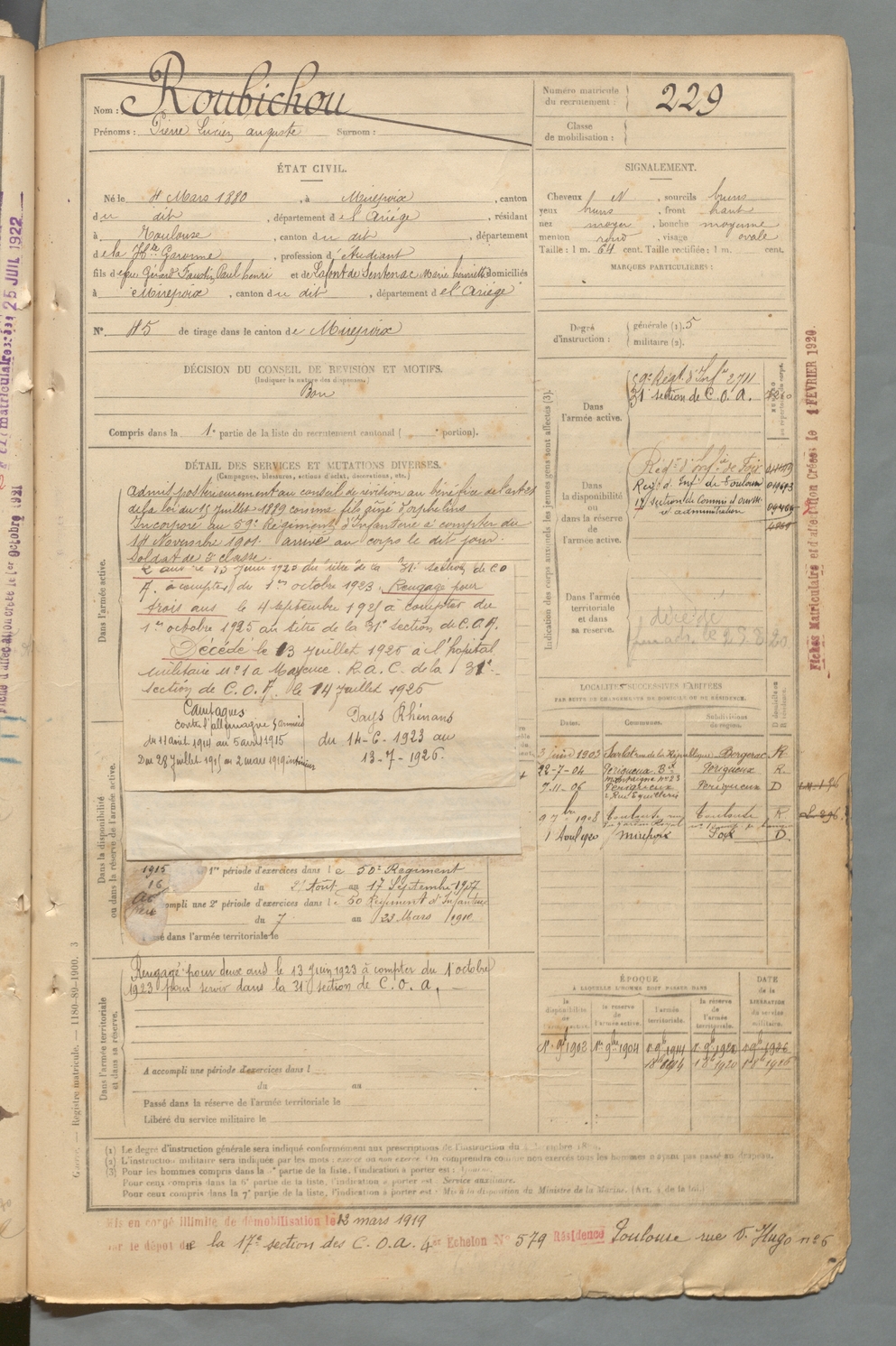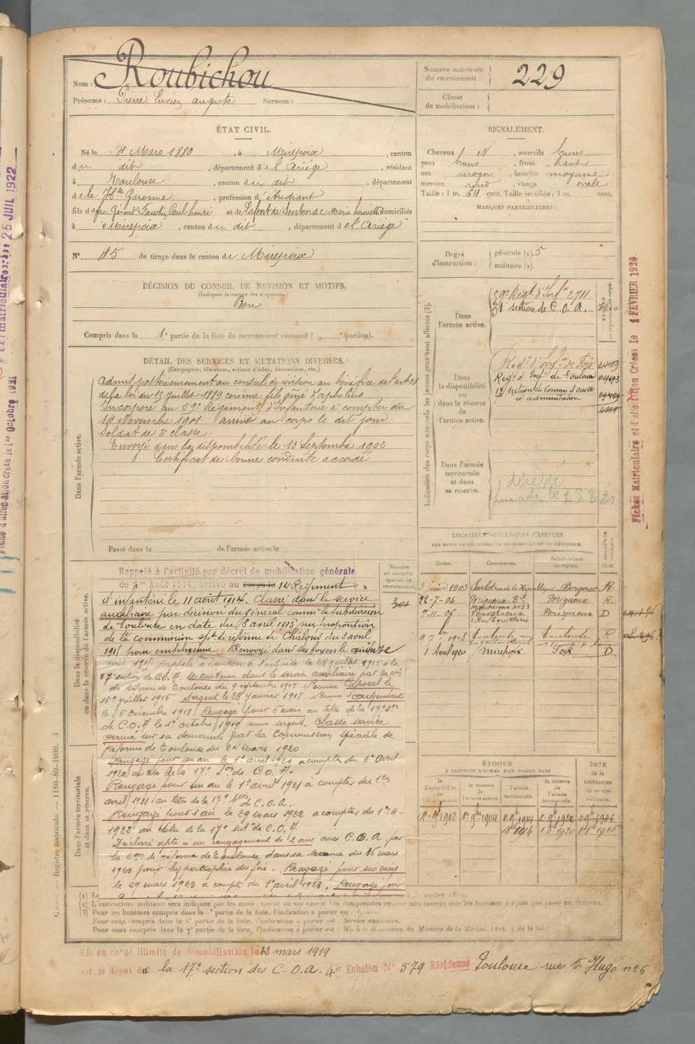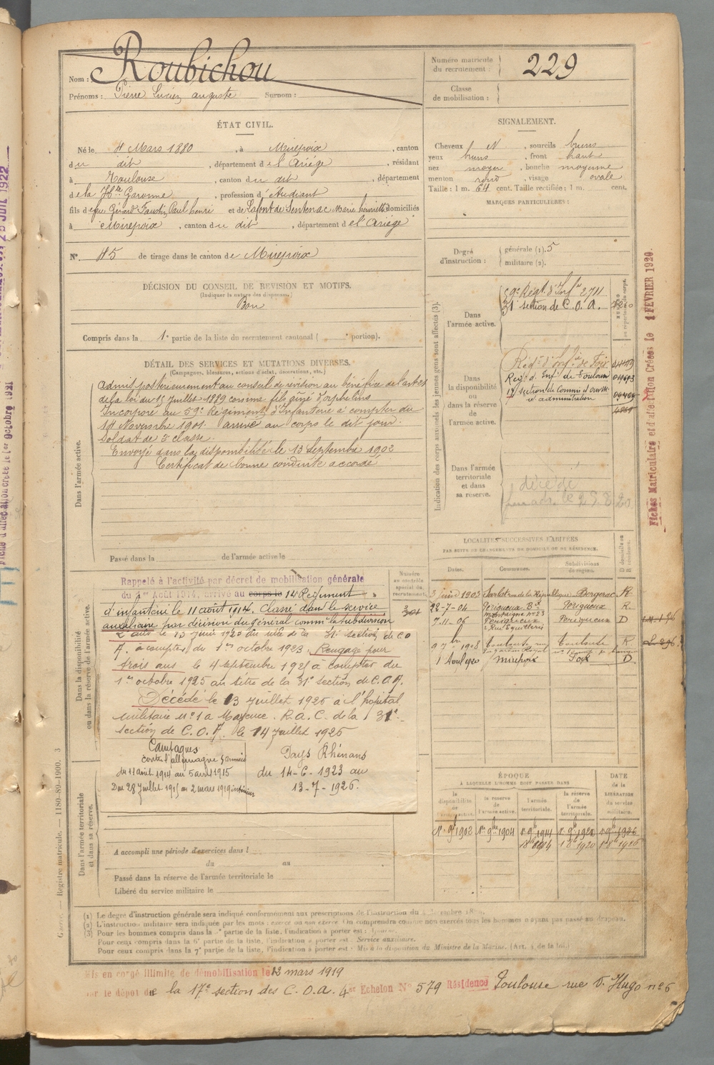 | Roubichou | Pierre Lucien Auguste | FOIX | 129 W 2 | 1900 | Mirepoix | Toulouse | 229 |