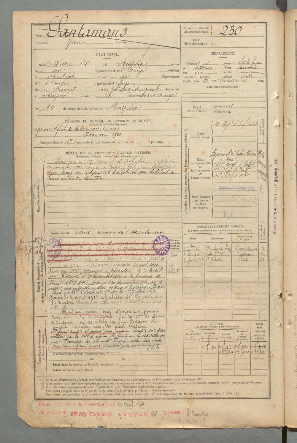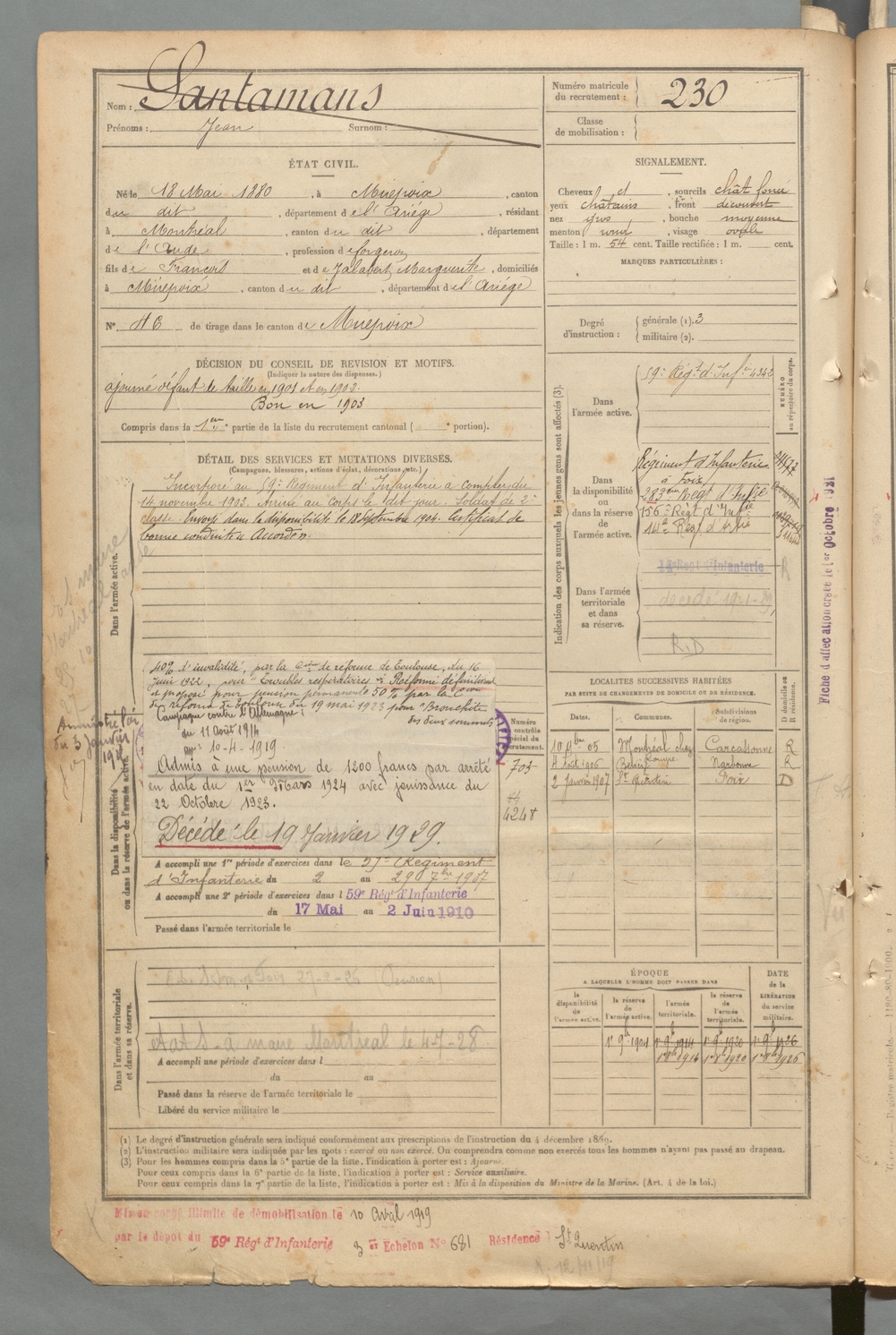 | Santamans | Jean | FOIX | 129 W 2 | 1900 | Mirepoix | Montréal | 230 |