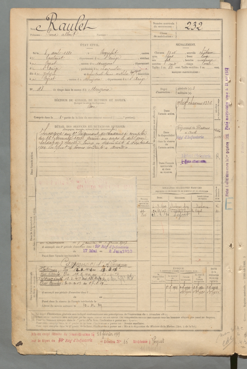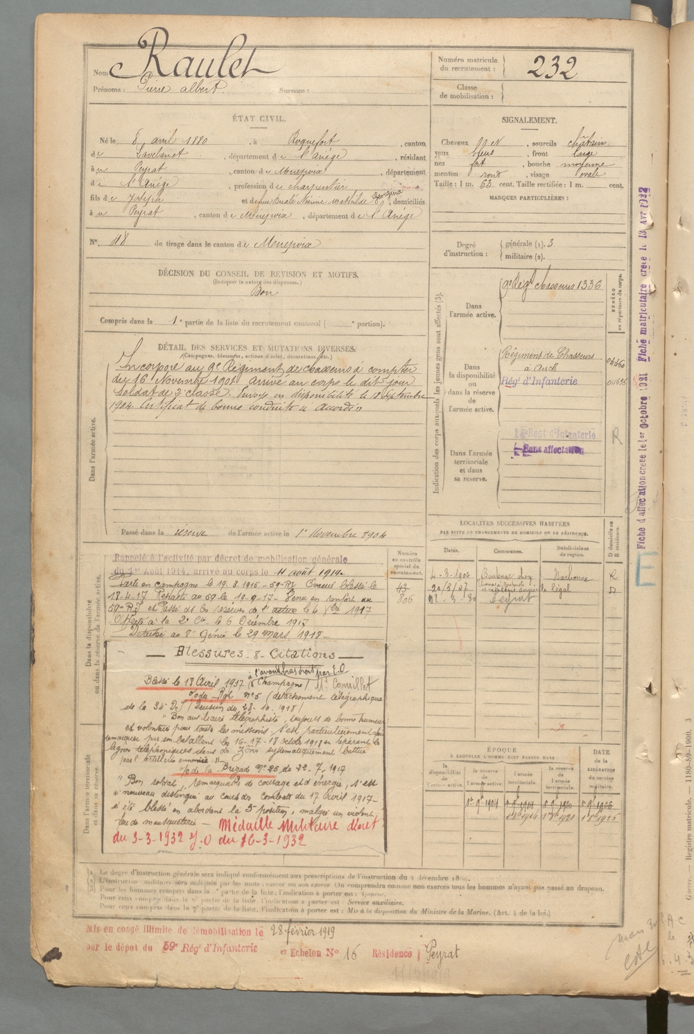 | Raulet | Pierre Albert | FOIX | 129 W 2 | 1900 | Roquefort | Peyrat (Le) | 232 |