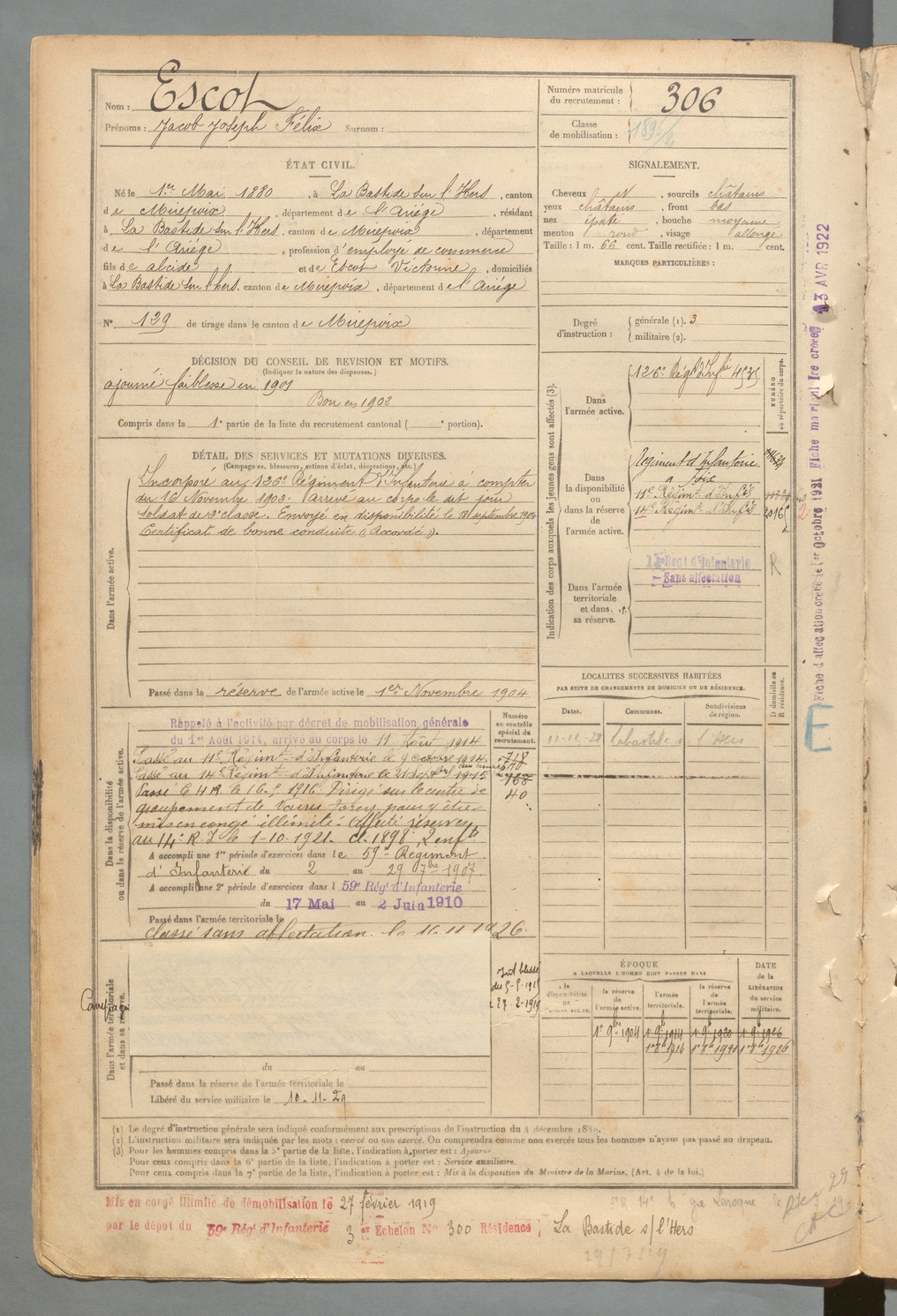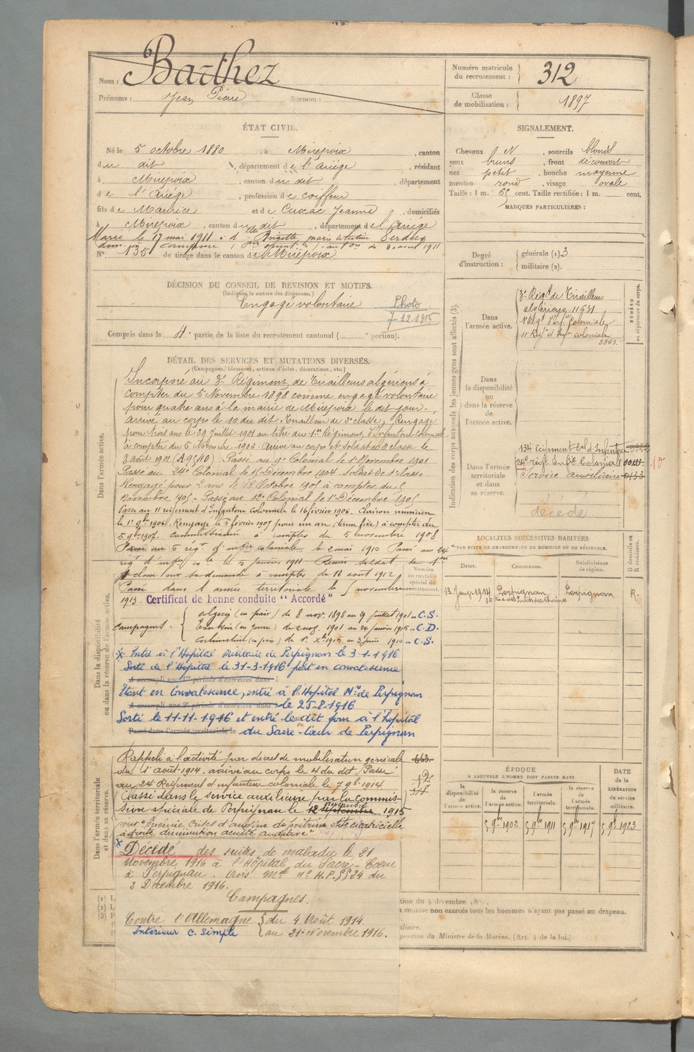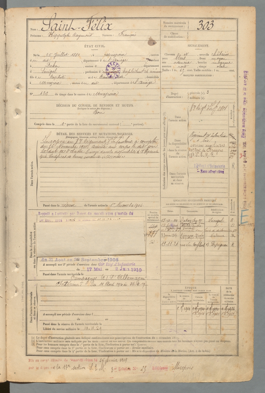 | Saint-Félix | Hippolyte Raymond dit François | FOIX | 129 W 2 | 1900 | Mirepoix | Dakar | 303 |