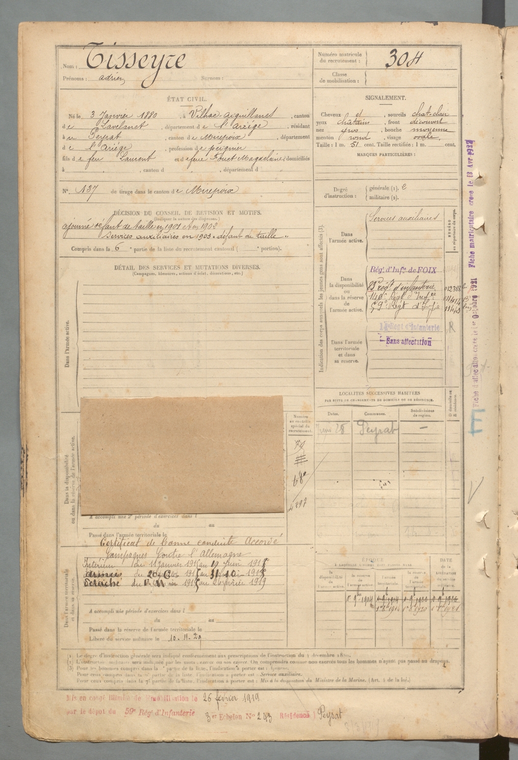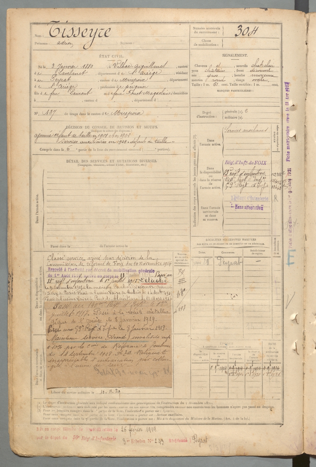 | Tisseyre | Adrien | FOIX | 129 W 2 | 1900 | Vilhac-Aiguillanes | Peyrat (Le) | 304 |