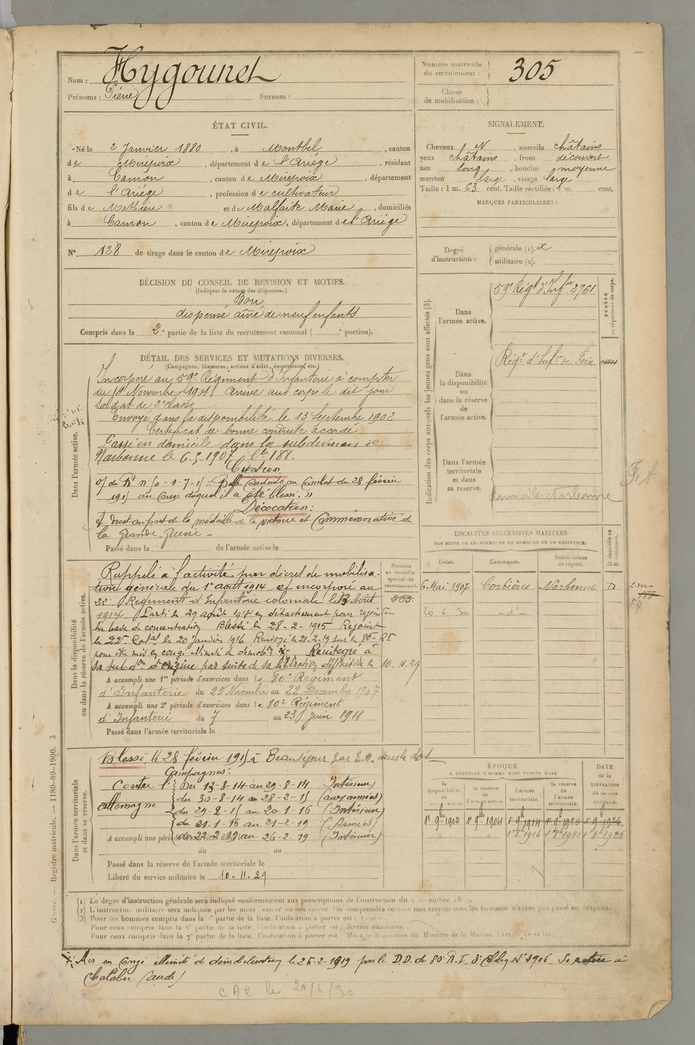 | Hygounet | Pierre | FOIX | 129 W 2 | 1900 | Montbel | Camon | 305 |
