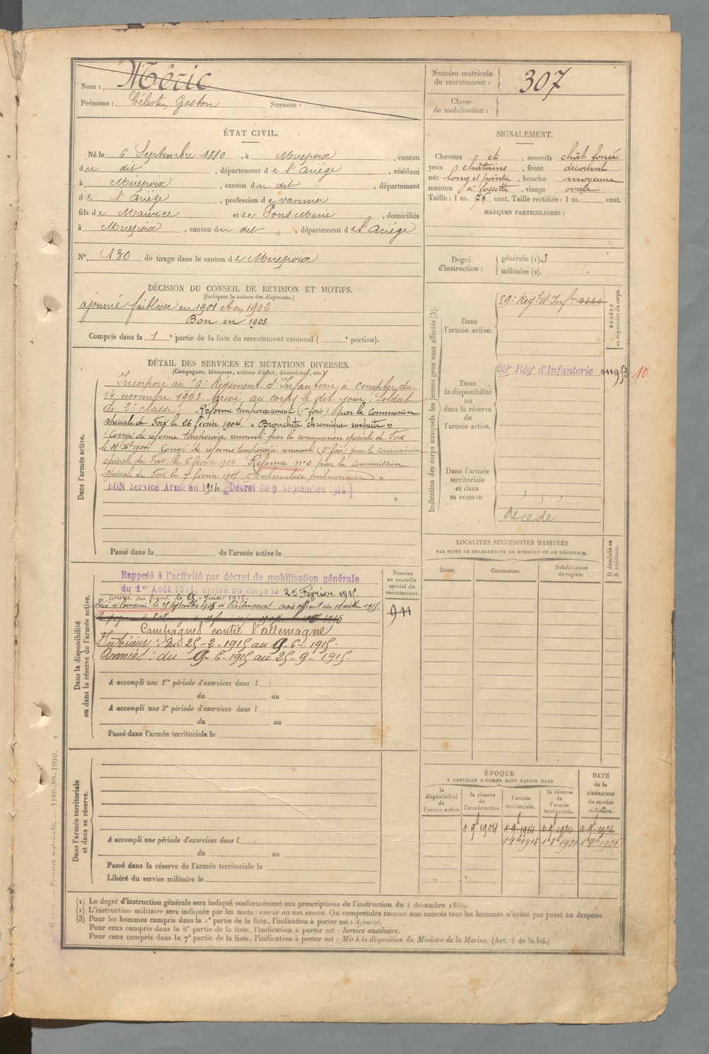 | Méric | Célestin Gaston | FOIX | 129 W 2 | 1900 | Mirepoix | Mirepoix | 307 |